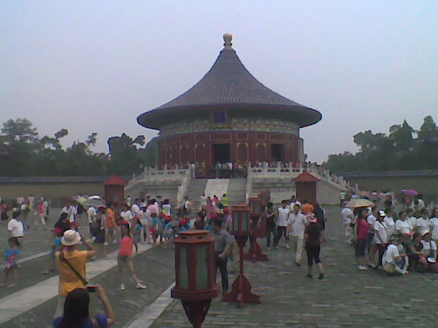 Dnes dopoledne jsme navstivili chram nebes.Sem se chodili cinsti cisarove modlit a obetovat za dobry rok a urodu.Na prvni fotce je sin modliteb za dobrou urodu,nejvyssi stavba v mimohradebni casti Pekingu te doby (37,5 metru). Objekt na druhe fotce,ktery vypada jako tripatrovy dort,je kruhovy oltar,kde cisar kazdy rok obetoval posvatneho buvola,aby byla dobra uroda.Na obetovani musel byt patricne pripraven a predtim musel stravit 3 dny v postnim palaci.Pokud motlitby a obeti nezabraly,ocitl se cisar v budove na treti fotce - nebeske cisarske hrobce.Vetsinou nasledkem vzpoury hladoveho lidu.V arealu je take kruhova zed,na jejiz jedne strane se zasepta a na druhe je to slyset.Bohuzel,pokud septa halda cinanu,vyjde z toho nesrozumitelny rev.To same plati o dutem kameni,ktery udajne vrati dve ozveny. I tech ozven bylo nekolik tisic najednou.