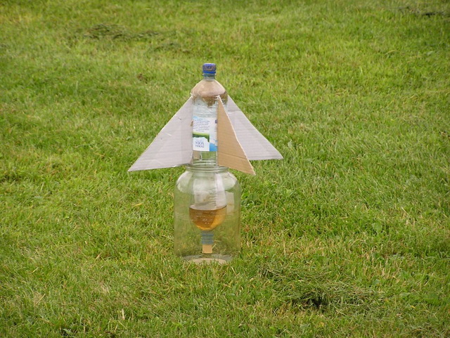 Ke stavbě této rakety opět použijeme PETku a korkový špunt. Navíc potřebujeme 5 litrovou skleněnou láhev, niť, ubrousek, papír, ocet a jedlou sodu. Z PETek vyrobíme tělo rakety a přilepíme na něj 4 křidélka. Raketu obrátíme na špičku, rakety nalijeme přibližně 3 cm octa. Do hrdla strčíme papírový ubrousek, do kterého nasypeme jedlou sodu. Okolo přečnívající části ubrousku ovážeme nit. Do hrdla lahve zatlačíme špunt, tak aby ubrousek byl zavěšen v raketě přibližně uprostřed.