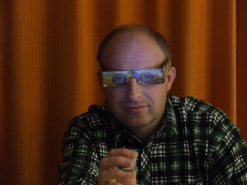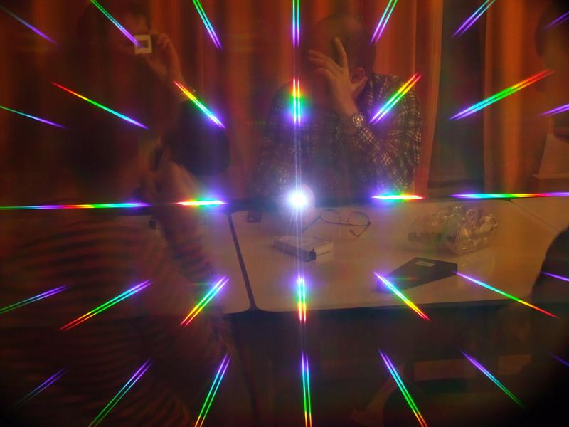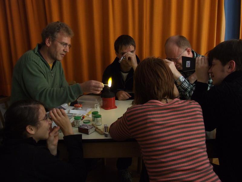| 1) pomocí speciálního filtru, který jsme umístili před fotoaparát, jsme mohli vyfotografovat spojité spektrum ledkové svítilny | 2) každý dostal svůj spektroskop a mohl pozorovat spektrální čáry jednotlivých chemických prvků | |