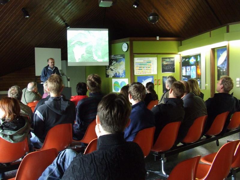 | 17) celkový pohled na radioteleskop při cestě na parkoviště | 18) přednáška o radiové astronomii v přednáškovém sále observatoře Effelsberg | |