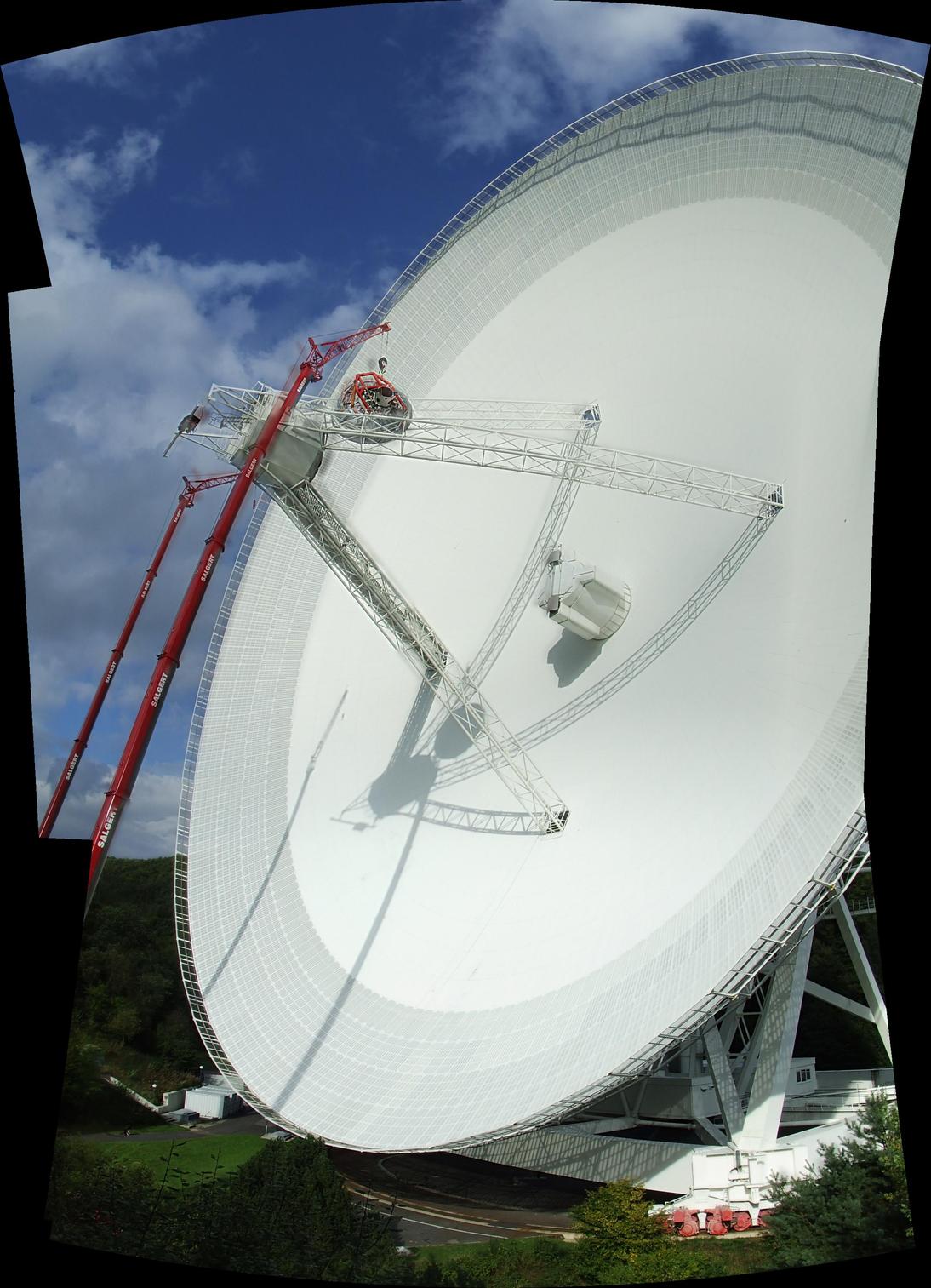| 9) Pohled na radioteleskop z přístupové cesty | 10) Sekundární zrcadlo těsně před samotnou instalací | |