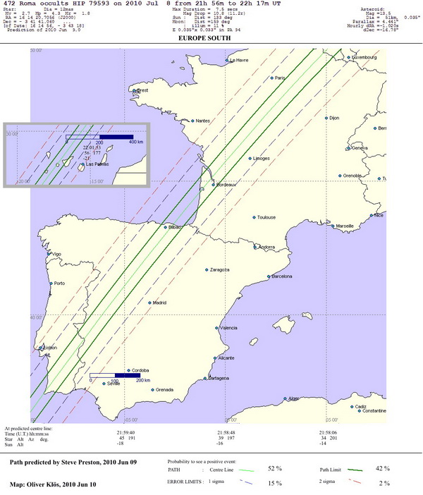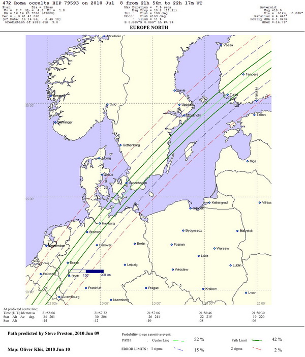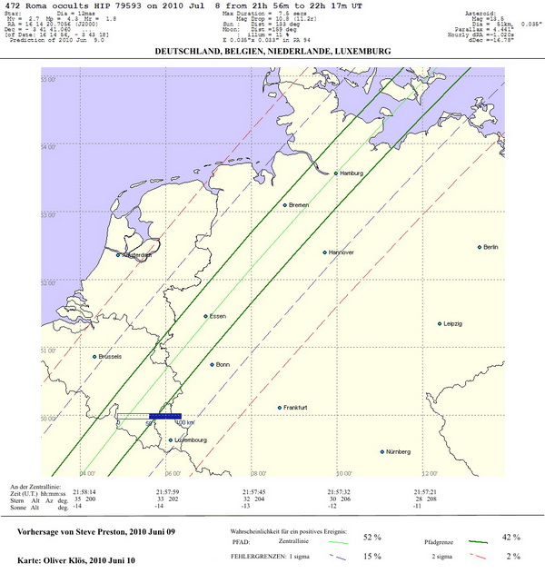 Možná někteří z vás již zaznamenali, že se chystá expedice do Německa za mimořádným zákrytem hvězdy planetkou Roma (472). Mimořádnost tohoto úkazu spočívá především v jasnosti zakrývané hvězdy, která činí 2,7 mag (vizuální jasnost). K úkazu dojde 8. července 2010 v pozdních večerních hodinách, kdy planetka Roma zakryje hvězdu delta Ophiuchus v souhvězdí Hadonoše.
