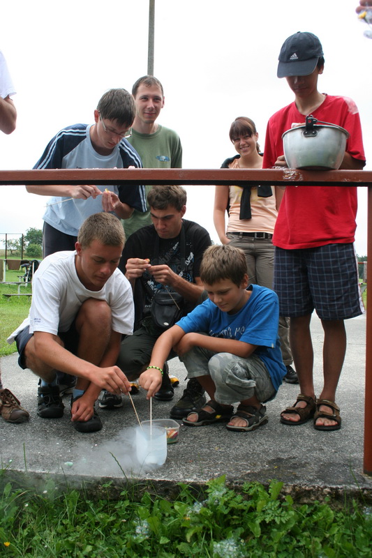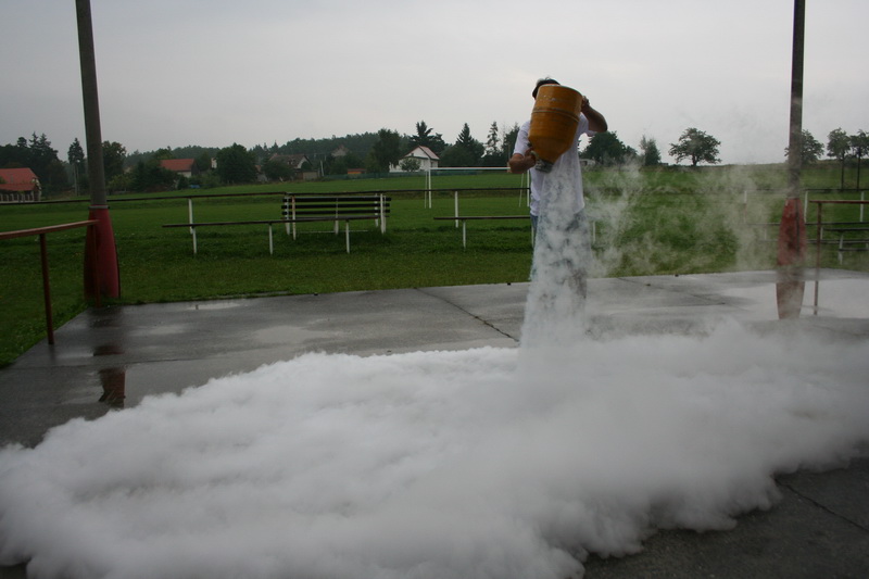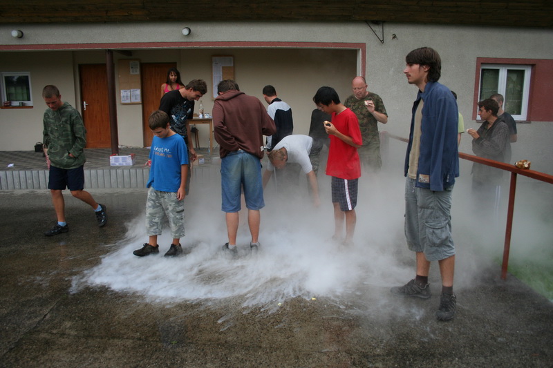 Protože všichni přítomní měli za sebou pozorovací noc, neboť ze čtvrtka na pátek vrcholilo maximum meteorického roje Perseid, byl budíček posunut až na devátou hodinu. K rychlému vzbuzení spáčů se využil tekutý dusík uzavřený do PET lahve. Pokud jste již tento pokus někdy viděli či spíše slyšeli, jistě tušíte, že probuzeni byli všichni najednou. Po krátké expediční snídani a úklidu tábora se mladí astronomové seznamovali s tekutým dusíkem. Ten má teplotu -196°C, velmi rychle se vypařuje, a proto nesmí být v uzavřených nádobách (proto má takový úspěch pokud uzavřete tekutý dusík do PET lahve). Převáží se ve speciálních nádobách, které se nazývají devarky. Cena dusíku je pouhých 5 Kč za litr, bohužel ale pro běžného smrtelníka je tato látka nedostupná.