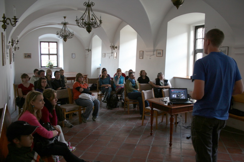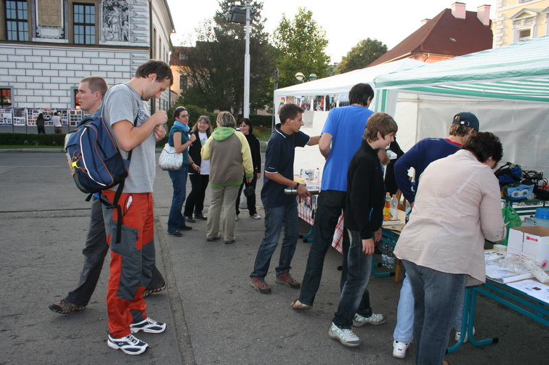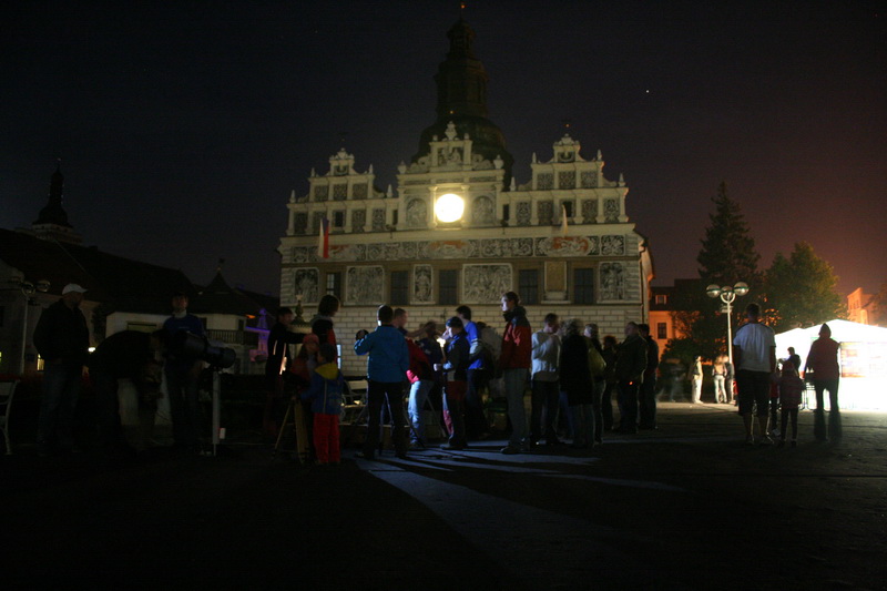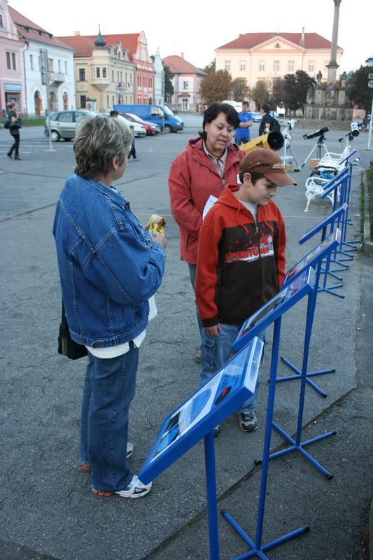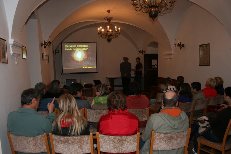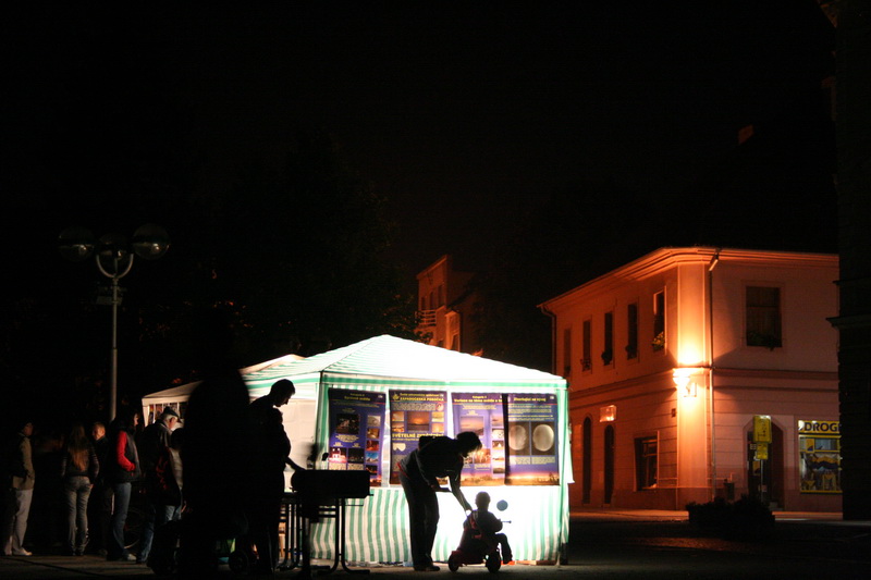 Začátek byl stanoven na 18. hodinu. V tu dobu již stály na ploše náměstí dva stany a šest dalekohledů a v budově radnice začala série přednášek, kterou zahájil náš kolega O. Trnka s tématem“Cesta na Měsíc nebo podvod století?“ následovaný „šéfkami“ Stříbrujářů PhDr. Jitkou Soukupovou a Mgr. Naďou Zíkovou, které seznámily přítomné s tím, co nejzajímavějšího viděly na Expo Science Afrique 2010 na Réunionu. Přednáška Mgr. Vladislava Rappricha, PhD. z České geologické služby Praha byla věnována příčinám, průběhu a dopadům jarní vulkanické činnosti na Islandu. Jako poslední se slova ujal náš kolega M. Randa s přednáškou „Chicxulub, Tunguzka, .... Kdy čeká Zemi další srážka?“.