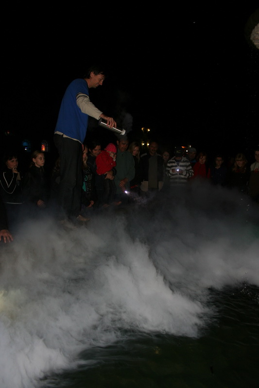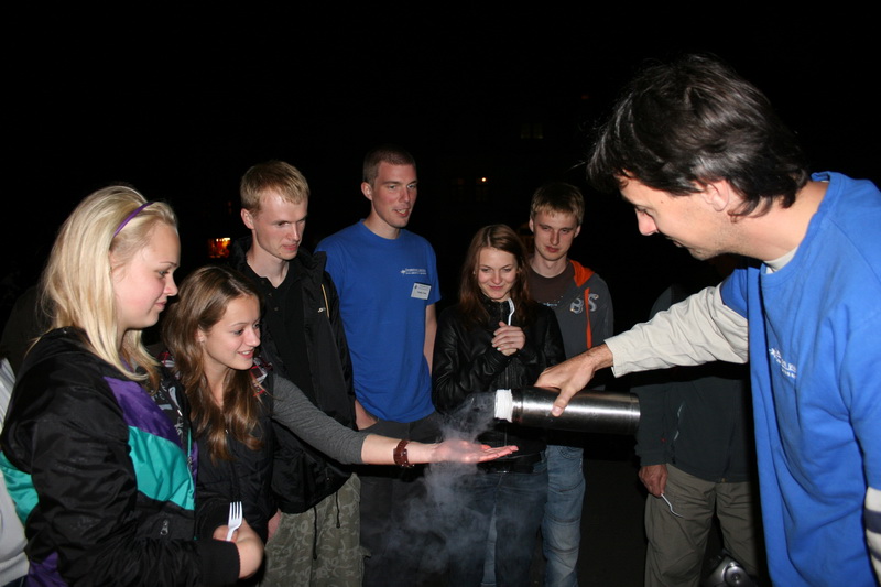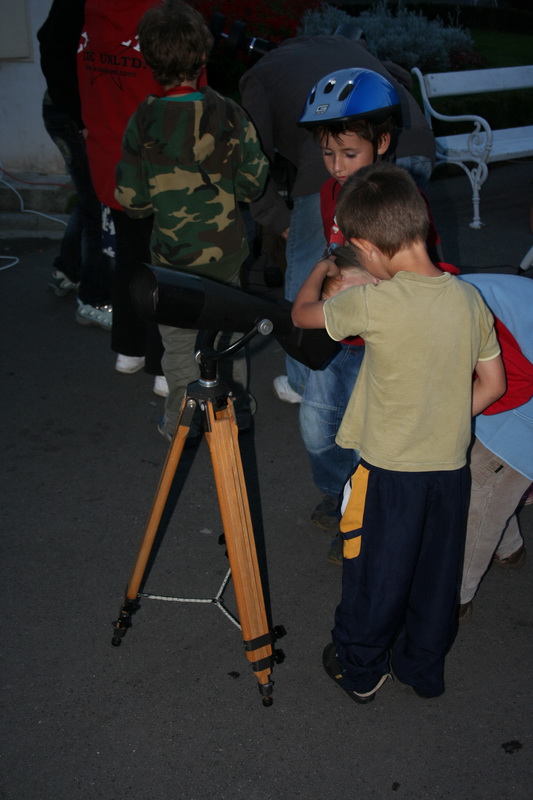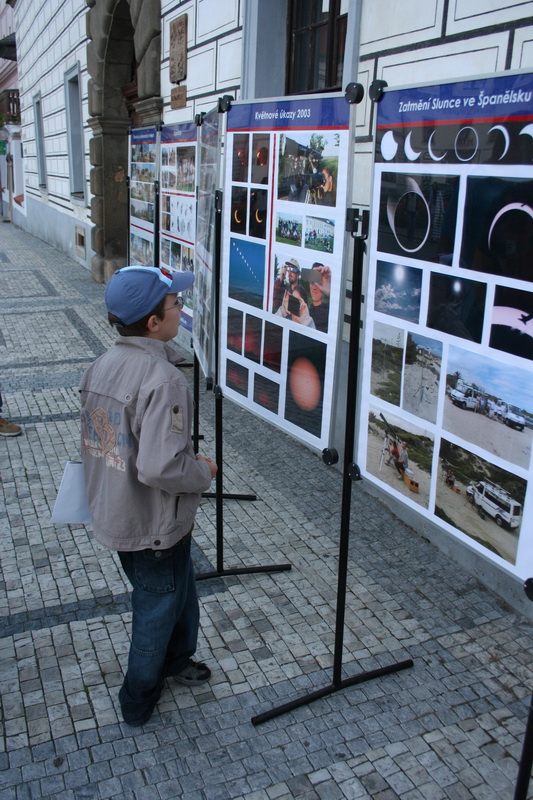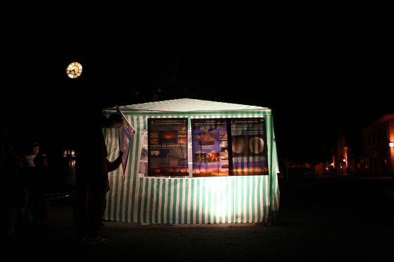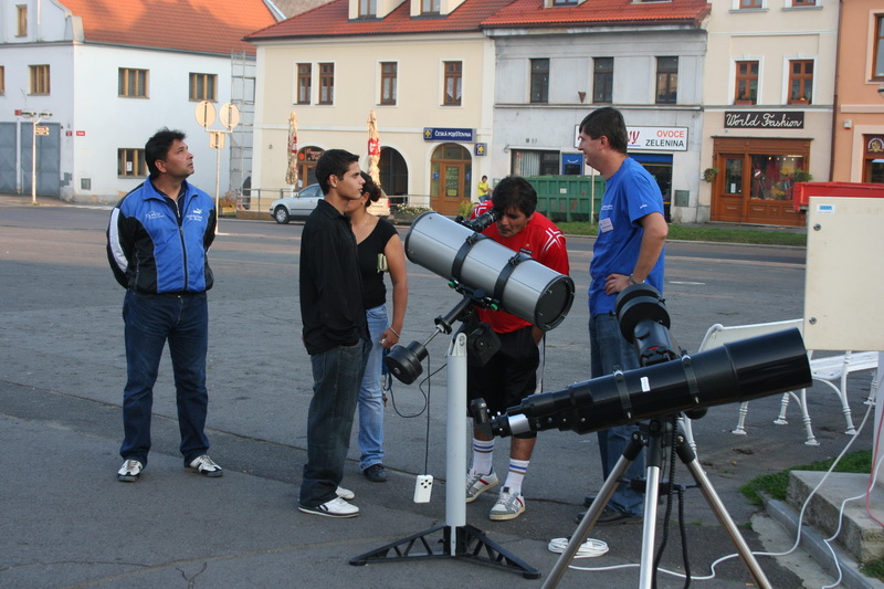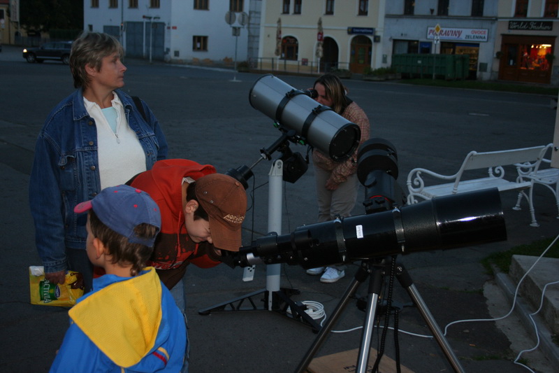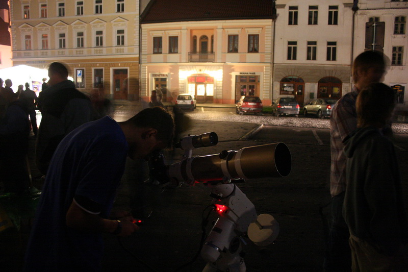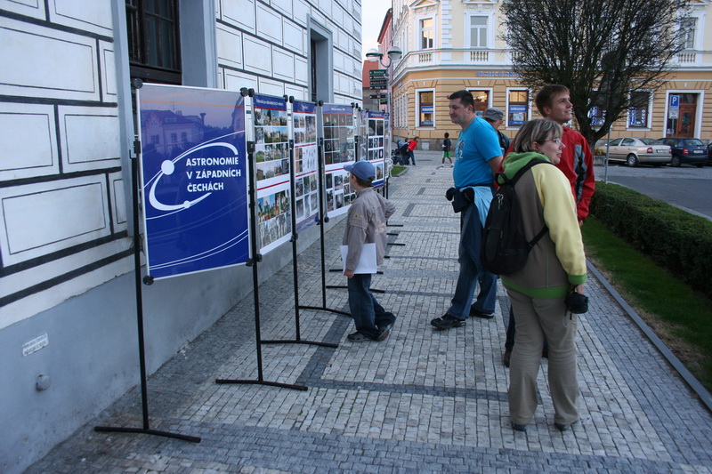 Po celou dobu venku v obou stanech probíhaly ukázky fyzikálních pokusů, v prvním Astronomická kuchařka pod vedením M. Česala a ve druhém „show“ místních Stříbrujářů. Nezahálely ani dva Dobsony, dva refraktory (které zapůjčila HaP Plzeň) a jeden Newton na paralaktických montážích. Návštěvníci měli možnost se podívat na Měsíc, Jupitera a jeho čtyři měsíce a několik deep-sky objektů. Jejich pozorování ale neprobíhalo dlouho, vzhledem ke zhoršujícím se podmínkám. Využití našel i Somet monar, kterým se především nejmenší návštěvníci dívali většinou na svítící hodiny na budově radnice a před setměním také na nedaleké čapí hnízdo.