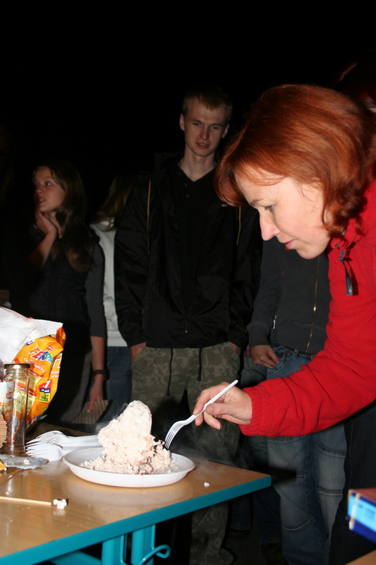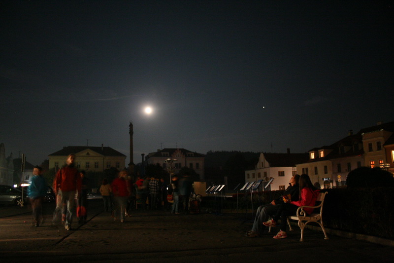 Po třiadvacáté hodině oblačnost zhoustla natolik, že z oblohy zmizely Galileovské měsíce následované po krátké chvíli i vlastním Jupiterem a návštěvníci, kteří absolvovali poslední přednášku, tak již měli v dalekohledech pouze možnost posoudit, jak vypadá Měsíc přes vrstvu oblačnosti. Poté se setmělé náměstí začalo vyprazdňovat a my začali pomalu balit. Celá akce skončila krátce po půl dvanácté.