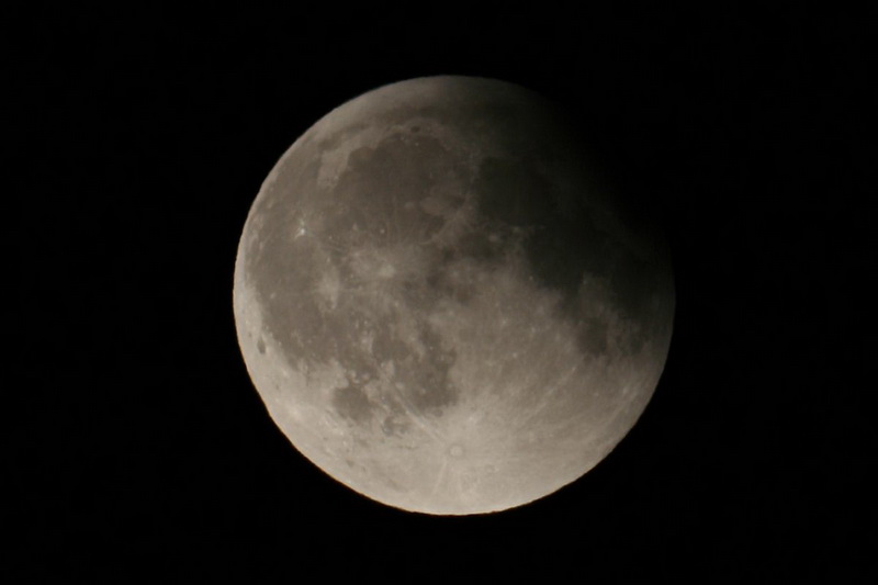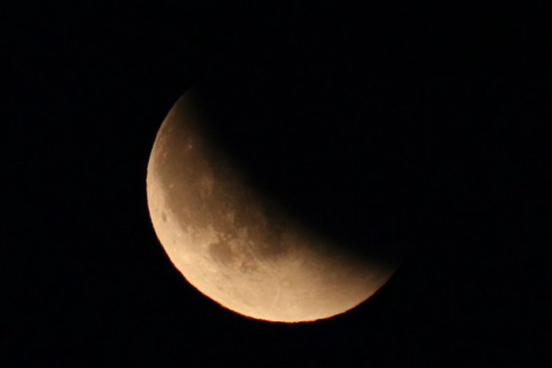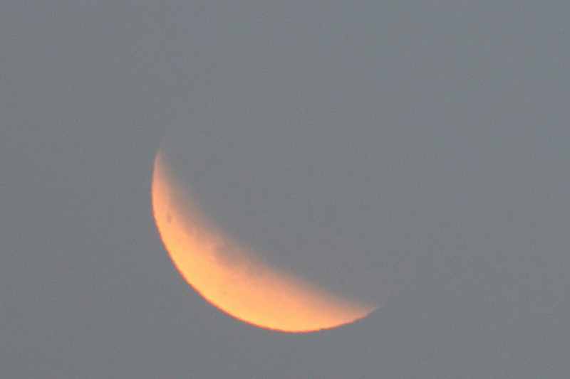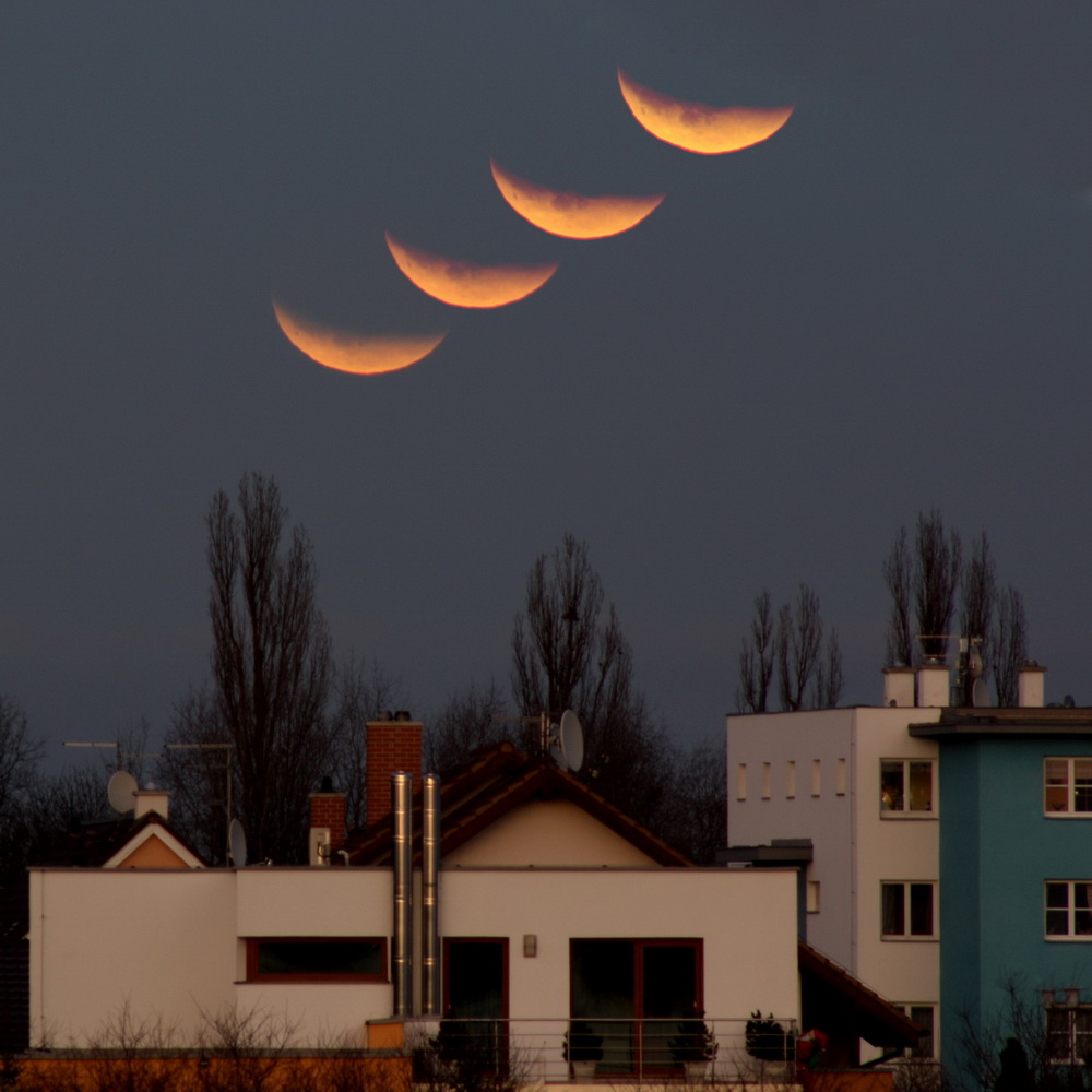 Bohužel tolik štěstí jako Jakub jsem neměl. V den zatmění jsem se ne vlastní vinou vracel z Plzně až v době, kdy Měsíc byl již několik stupňů nad obzorem. V místě, kde se po dálnici sjíždí k mostu přes Klabavu, se mi otevřel krásný výhled na východní obzor, na kterém se jen několik málo stupňů nad horizontem objevila krásně svítící „kolébka“. Proto jsem ani nejezdil domů, rychle sjel z dálnice na vedlejší silnici směrem na Litohlavy a jen pomocí základního objektivu vyfotografoval sérii snímků, kterou jsem složil za pomoci programu Registax. Bohužel počasí v Rokycanech nebylo tak pěkné jako v Plzni a v průběhu fotografování přes Měsíc přecházely mraky, které závěr pozorování prakticky znemožnily.