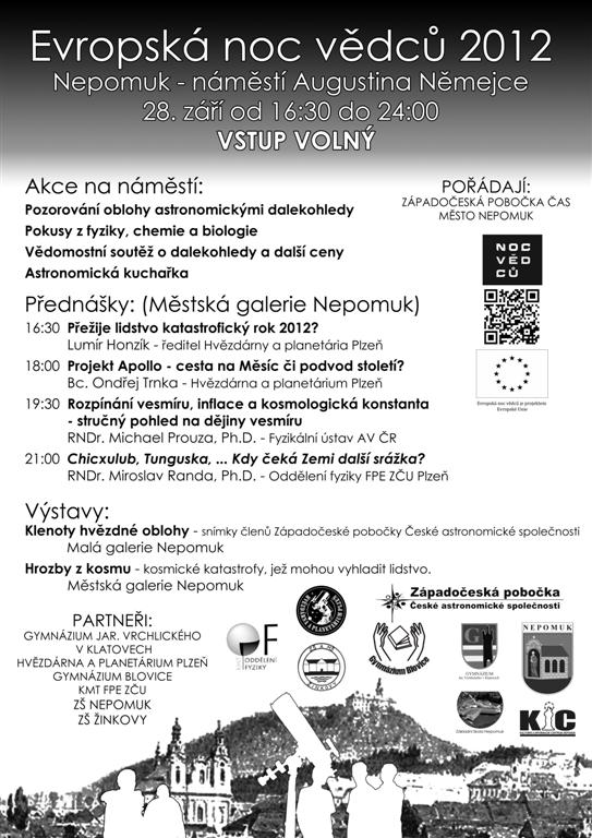 Západočeská pobočka České astronomické společnosti se tohoto projektu účastní již osmým rokem a od roku 2010 využívá této akce Noci vědců k propagaci vědy i na místech mimo vědecká centra velkých měst, hvězdáren či univerzit. Jako svá působiště vybírá lokality, pro jejichž obyvatele by akce tohoto typu byla těžko dostupná. Po velmi dobrých ohlasech z předchozích ročníků ve Stříbře a Přešticích, jsme se rozhodli letošní Noc vědců 2012 uspořádat ve městě Nepomuk, kde se budou moci občané města seznámit s naším velmi bohatým programem.