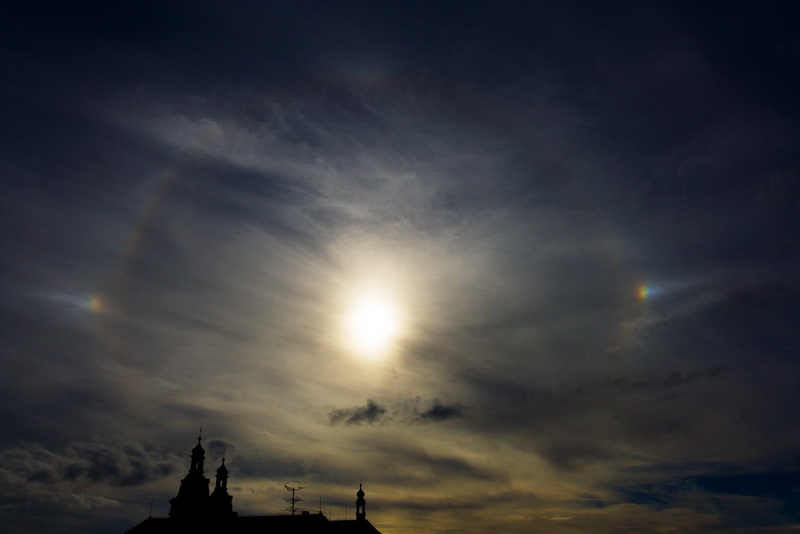 Každý správný astronomický program musí být zpestřený astronomickým pozorováním. Ne jinak tomu bylo i v Nepomuku, kde se na poslední chvíli umoudřilo počasí a my mohli pozorovat dovezenými dalekohledy nejenom sluneční skvrny či protuberance, ale i hvězdokupy a další deep sky objekty. Což by nebylo možné bez zhasnutého pouličního osvětlení a kostela, které pro nás zajistilo město. Bohužel jedinou kaňkou na kráse byl Měsíc takřka v úplňku, který znemožňoval pozorování slabších objektů. Na druhou stanu nás mohou těšit krásné fotografie halových jevů, které jsme pozorovali ještě před západem Slunce. Kromě samotných astronomických objektů si také návštěvníci našeho programu mohli povšimnout létajících a barevně blikajících objektů po obloze, které nebyly ničím jiným než modelářskou show v podání Michal Smutného a Matuše Čopana.