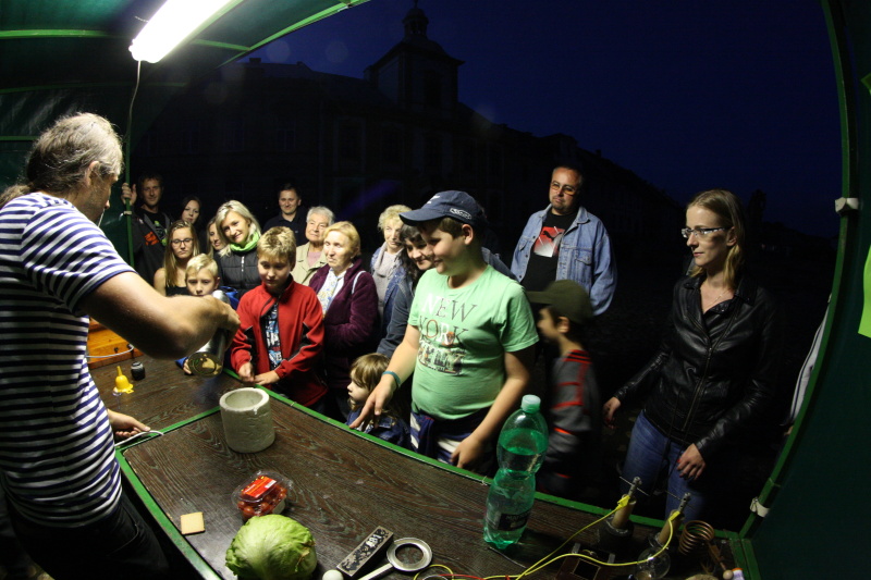 Komplikace se nám nevyhnuly ani při instalaci přivezených materiálů v Manětíně. Z důvodu avizované nepřízně počasí jsme měli připravené dvě varianty, tzv. suchá a tzv. mokrá pro nepřízeň počasí. Mokrá varianta spočívala v tom, že vyložíme všechny věci v místním kinosále, kde by se odehrával celý program. Jenomže po složení materiálu v předsálí kinosálu a odjezdu dodávky zpět do Plzně, se obloha začala pomalu ale jistě protrhávat, až se nakonec protrhala natolik, že se bez větších problémů nechalo pozorovat Slunce. Nakonec se tedy přivezená technika stěhovala z kinosálu na místní náměstí, kde jsme pak s astronomickými dalekohledy vydrželi pozorovat až do naplánované 23 hodiny. Kromě připravených dalekohledů na pozorování sluneční fotosféry a chromosféry si mohli účastníci akce prohlédnout na noční obloze i řadu deep-sky objektů. Bohužel v průběhu večera byly pozorovací podmínky velmi proměnlivé, ale i tak se u velkých dalekohledů jakými byly například Meade 350 nebo Newton 406 vystřídalo velké množství pozorovatelů. Kromě samotného pozorování na náměstí se účastníci mohli seznámit s celou řadou zajímavých pokusů u stánku Oddělení fyziky PEF ZČU, kde si například mohli sáhnout i na 200 000V. Pro ty nejmenší zde byly nainstalované hry s astronomickou tématikou. Zároveň se nám podařilo připravit i drobné dárky ve formě krabiček s Manětínskou tmou, ale o tom až v příštím článku.