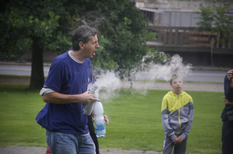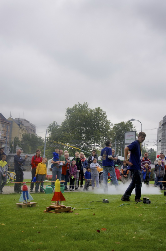 DNY VĚDY A TECHNIKY V PLZNI jsou nejvíce navštěvovanou akcí, které se Západočeská pobočka České astronomické společnosti účastní během roku. Letošní již devátý ročník se uskutečnil v termínu 12. a 13. 9. 2014. Podobně jako v předchozích letech si malí i velcí návštěvníci mohli v našem stánku vyrobit a také vystřelit raketu z PET láhví. Na improvizovaném „kosmodromu“ kromě již zmiňovaných raket z PET láhví startovaly i rakety na tuhá a alternativní paliva. Náš stánek byl tradičně umístěn před budovou Západočeského muzea společně se stánky Hvězdárny a planetária Plzeň, Hvězdárny v Rokycanech a Oddělení fyziky FPE, kde se jednotlivé aktivity pořádajících organizací vzájemně doplňovaly. Jedna z nejnavštěvovanějších „atrakcí“ našeho stanoviště byla jednoznačně dusíkatá show, která mimo jiné spočívala v explozi PET láhví naplněných dusíkem. Bohužel celý letošní program byl značně ovlivněn nepříznivým počasím, což se do značné míry projevilo i na návštěvnosti. Téměř celý pátek pršelo a tak nás zachránila až sobota, kdy se počasí alespoň trochu umoudřilo a přestalo pršet. Akce se dle našich odhadů zúčastnilo cca 8000 návštěvníků. Příjemným zpestřením byl štáb České televize, který si vybral do své reportáže i naše aktivity viz odkaz na archiv České televize.