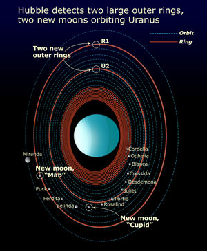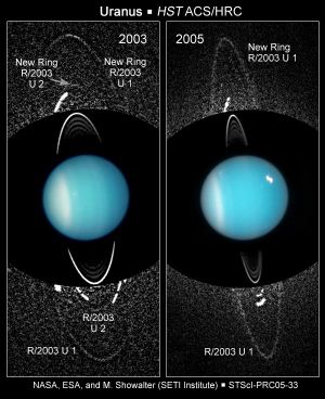A ještě jedna zmínka o planetě Uran, konkrétně se jedná o její systém prstenců. Právě v březnu tomu bude 30 let, co pánové James L. Elliot, Edward W. Dunham a Douglas J. Mink z Kuiperovi observatoři v Aiborne ohlásili v roce 1977 objev Uranův systém planetárních prstenců, který je nezřetelný a skládá se z tmavých balvanů, které mají kolem deseti metrů v průměru. Objev byl celkem neočekávaný, protože původně chtěli využít zákrytu hvězdy Uranem pro studium planetární atmosféry, ale následnou analýzou pozorování zjistili, že se hvězda ztratila z dohledu celkem pětkrát. Z toho usoudili, že se kolem planety musí nacházet systém prstenců, což bylo přímo potvrzeno sondou Voyager 2, která prolétla okolo Uranu v roce 1986. Objev dalších dvou slabých prachových prstenců byl oznámen v prosinci 2005 na základě snímků z HST ze srpna 2003.
