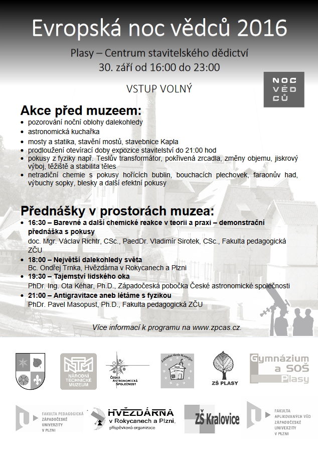 Západočeská pobočka České astronomické společnosti se tohoto projektu účastní již dvanáctým rokem a od roku 2010 využívá této akce k propagaci vědy i na místech mimo vědecká centra velkých měst, hvězdáren či univerzit. Jako svá působiště vybírá lokality, pro jejichž obyvatele by akce tohoto typu byla těžko dostupná. Po velmi dobrých ohlasech z předchozích ročníků ve Stříbře, Přešticích, Nepomuku, Klatovech, Domažlicích a Tachově jsme se rozhodli letošní Noc vědců 2016 uspořádat ve městě Plasy, kde se budou moci občané města seznámit s naším velmi bohatým programem.