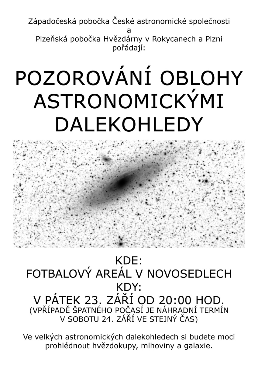 Chcete se podívat opravdu velkým hvězdářským dalekohledem na objekty vzdáleného vesmíru zdobící podzimní oblohu? Západočeská pobočka České astronomické společnosti a Hvězdárna v Rokycanech a Plzni pro vás připravily na pátek 23. září veřejné pozorování v Manětínské oblasti tmavé oblohy. Akce se uskuteční na fotbalovém hřišti v obci Novosedly mezi Pšovem a Manětínem. Po soumraku si ještě naposledy prohlédnete planetu Saturn a pak vás čeká večer plný vzdálených galaxií, hvězdokup a mlhovin pod jedinečnou tmavou oblohou. Pozorování bude samozřejmě doprovázeno odborným výkladem. V případě pátečního nepříznivého počasíse pozorování přesouvá na sobotu 24. září. Aktuální organizační informace najdete na facebookových stránkách ZPČAS.