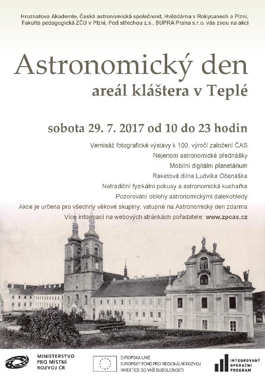 Přijměte pozvání na Astronomický den v areálu kláštera Teplá, který pořádá Česká astronomická společnost ve spolupráci s dalšími partnery v sobotu 29. 7. 2017. V tento den se areál kláštera promění na interaktivní výstavu složenou z několika expozic, které představí zábavnou formou astronomii, fyziku a kosmonautiku. Řadu věcí si přitom budete moci vyzkoušet na vlastní kůži. Proto neváhejte a přijďte navštívit klášter premonstrátů v Teplé, kde působily takové osobnosti, jakými byly Alois Martin David nebo Josef František Smetana.