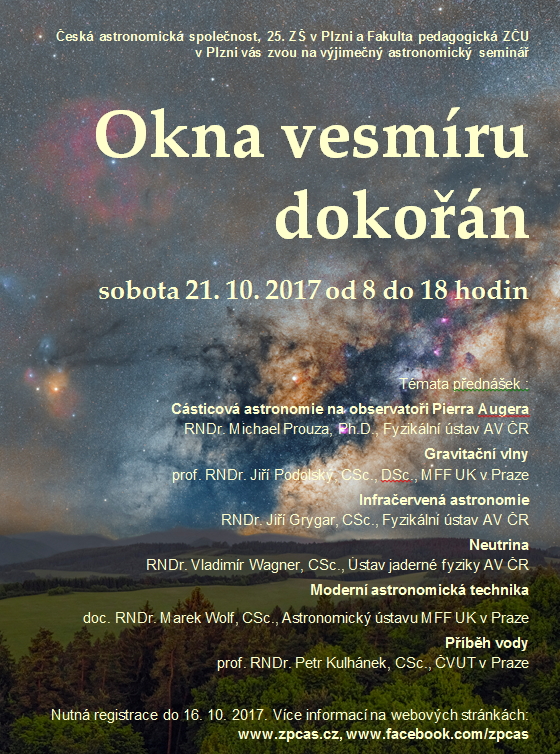 Výjimečný astronomický seminář „Okna vesmíru dokořán“ v Plzni 21. 10. 2017