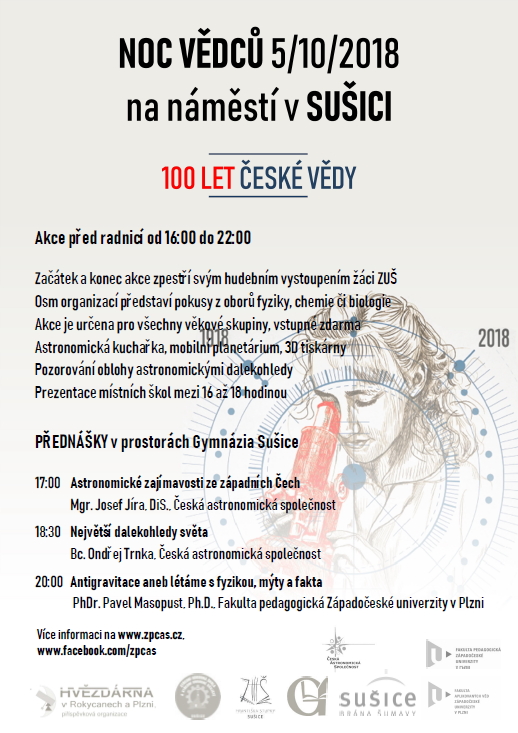 Západočeská pobočka České astronomické společnosti se tohoto projektu účastní již čtrnáctým rokem a od roku 2010 využívá Noci vědců k propagaci vědy i na místech mimo vědecká centra velkých měst či univerzit. Jako svá působiště vybírá lokality, pro jejichž obyvatele by akce tohoto typu byla hůře dostupná. Po velmi dobrých ohlasech z předchozích ročníků např. ve Stříbře, Přešticích, Nepomuku nebo Klatovech a dalších jsme se rozhodli letošní Noc vědců 2018 uspořádat v Sušici, kde se budou moci občané města seznámit s naším programem. Sušice byla v tomto roce vybrány záměrně, protože je posledním okresním městem, které jsme v rámci Evropské noci vědců ještě nenavštívili.