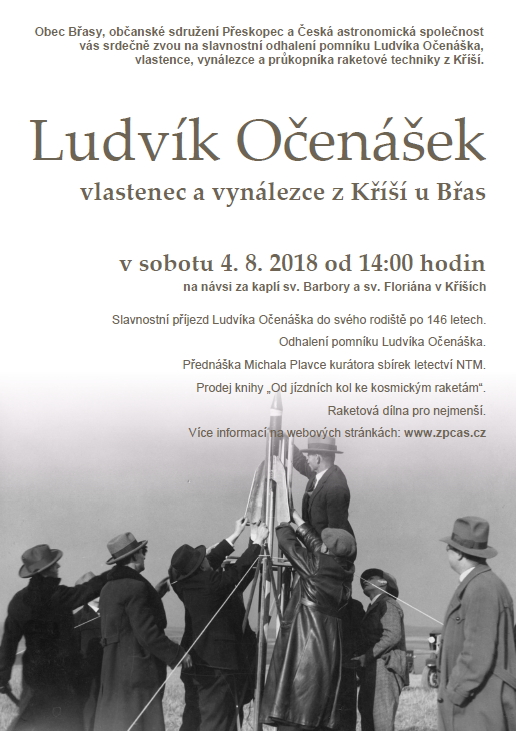 Obec Břasy, občanské sdružení Přeskopec a Česká astronomická společnost si vás dovolují pozvat na slavnostní na odhalení pomníku Ludvíka Očenáška konstruktéra, vynálezce, sokola a vlastence se zásluhami o stát. K slavnostnímu aktu dojde v rodišti Ludvíka Očenáška v obci Kříše u Břas v sobotu 4. srpna 2018 od 14 hodin na návsi za kaplí sv. Barbory a sv. Floriána. V roce, kdy si připomínáme sté výročí založení Československa.