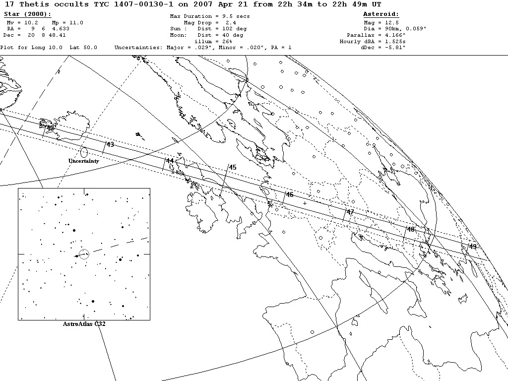 Jedná se o zákryt hvězdy TYC 1407-00130-1 (RA = 9:06:04,633; Dec = 20:08:48,41; 10,2 mag) planetkou 17 Thetis (12,5 mag). K úkazu podle předpovědi dojde v čase kolem 22:46:30 UT 21. 4. 2007, tedy krátce po půlnoci našeho času 22. 4. (0:46:30 SELČ). Hvězda se nachází v souhvězdí Raka, blízko hranice se Lvem a naleznete ji přibližně 5 stupňů východně od známé otevřené hvězdokupy Praesepe (Jesličky). Při pohledu z České republiky se vám oblast bude promítat v čase zákrytu nad západní obzor (A=267°) přibližně 29° vysoko nad horizont. Planetka má teoretický ideální průměr 90 km a trvání centrálního (nejdelšího) zákrytu bylo stanoveno na 9,5 s. Pro úspěšné měření časů vstupu a výstupu, kdy hvězda musí být bez problémů pozorovatelná, je nutno použít co největší dalekohled, jehož aktuální mezní hvězdná velikost se bude v okamžiku pozorování přinejmenším blížit 11. mag. Veškeré dostupné detaily o úkazu se dozvíte z připojeného obrázku.