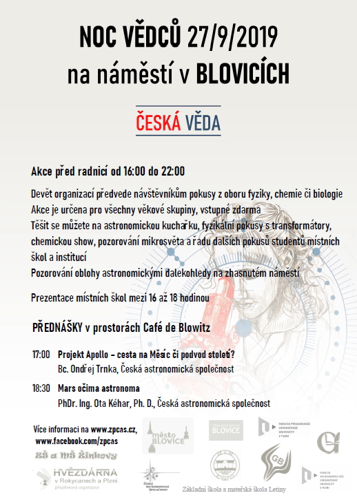 Západočeská pobočka České astronomické společnosti se tohoto projektu účastní již patnáctým rokem a od roku 2010 využívá Noci vědců k propagaci vědy i na místech mimo vědecká centra velkých měst či univerzit. Jako svá působiště vybírá lokality, pro jejichž obyvatele by akce tohoto typu byla hůře dostupná. Po velmi dobrých ohlasech z předchozích ročníků např. ve Stříbře, Přešticích, Nepomuku nebo Klatovech a dalších jsme se rozhodli letošní Noc vědců 2019 uspořádat v Blovivích, kde se budou moci občané města seznámit s naším programem.