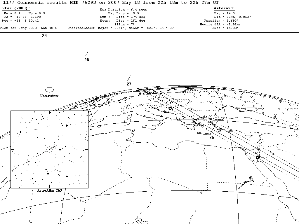 Krátce po půlnoci z pátku na sobotu (18./19. 5. 2007; 22:26:20 UT) střední Evropu opět protne pás stínu zákrytu hvězdy planetkou. Úkaz má sice své zápory, ale klady tentokrát převažují, a to je také důvod, proč by měl každý zájemce o tento typ astronomických měření zpozornět.