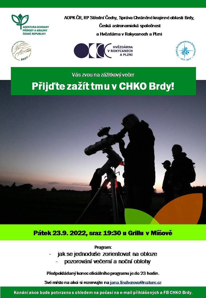 Správa Chráněné krajinné oblasti Brdy, Hvězdárna v Rokycanech a Plzni a Česká astronomická společnost vás zvou na zážitkový večer plný tmy v CHKO Brdy, který se uskuteční 23. 9. 2022 v Míšově.