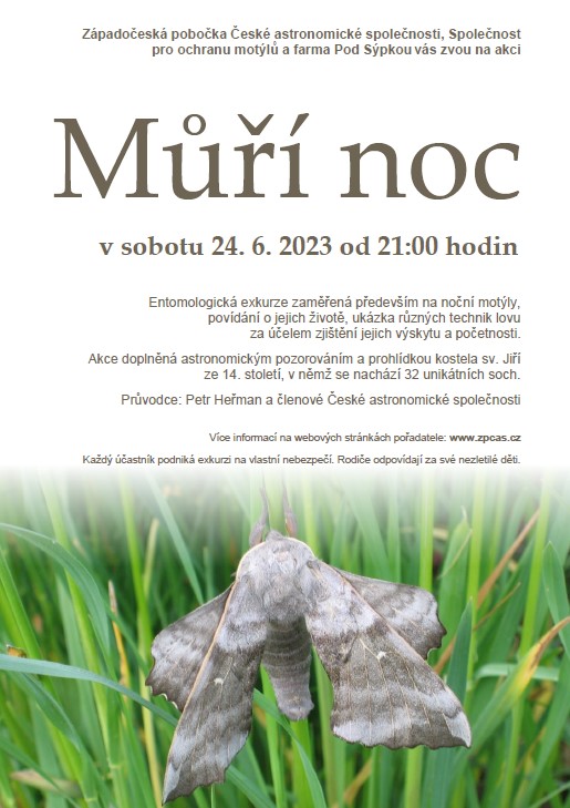 Západočeská pobočka České astronomické společnosti ve spolupráci se Společností pro ochranu motýlů, Luková - kostel svatého Jiří, farma Pod Sýpkou si vás dovolují pozvat na akci Můří noc, která se uskuteční v sobotu 24. 6. 2023 od 21h v Lukové.