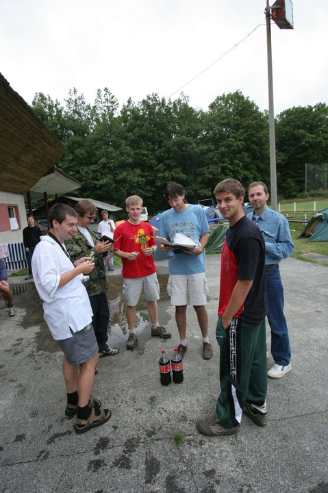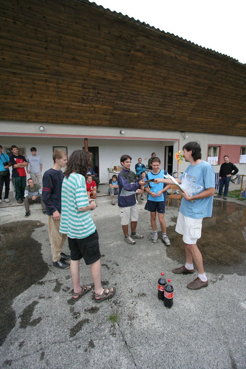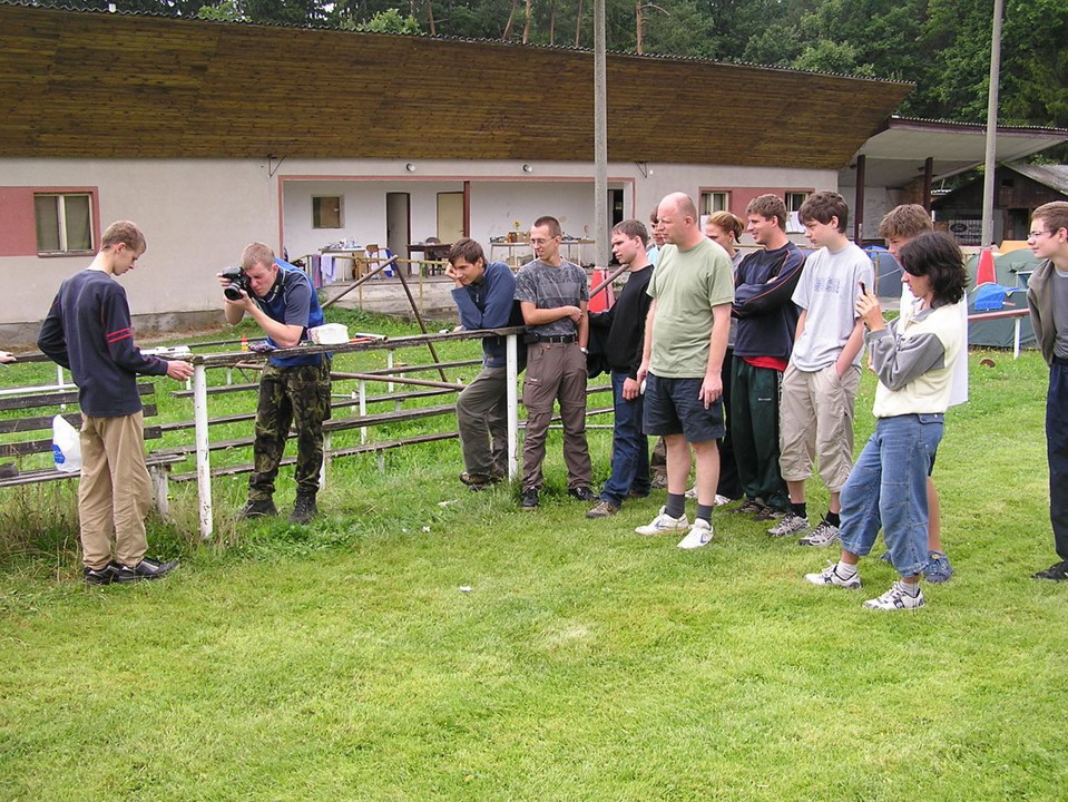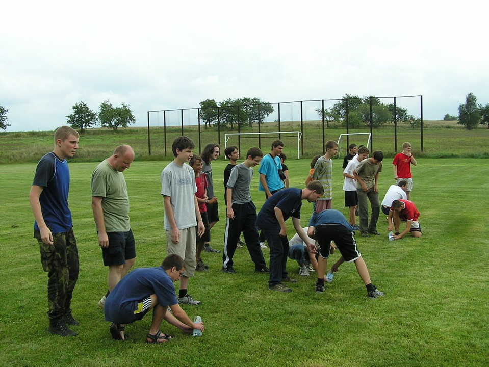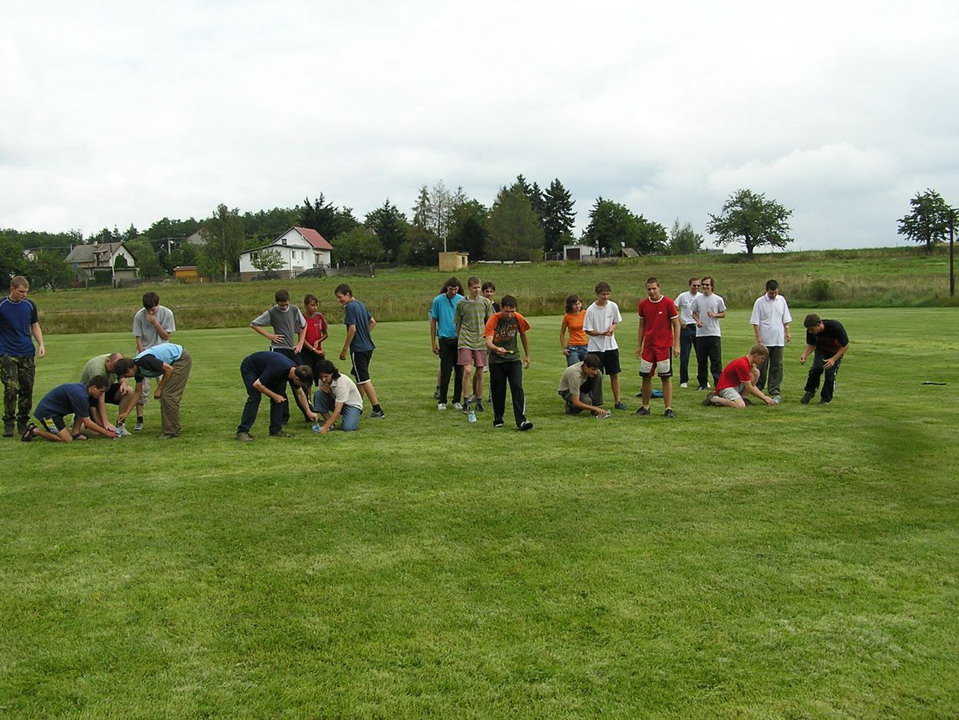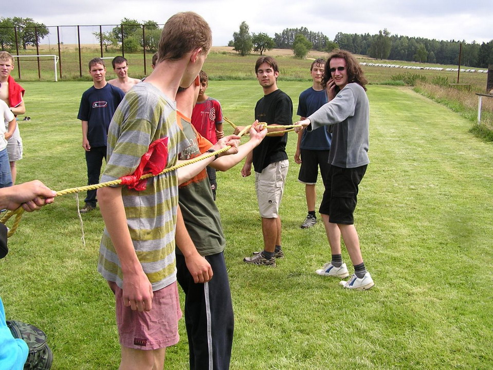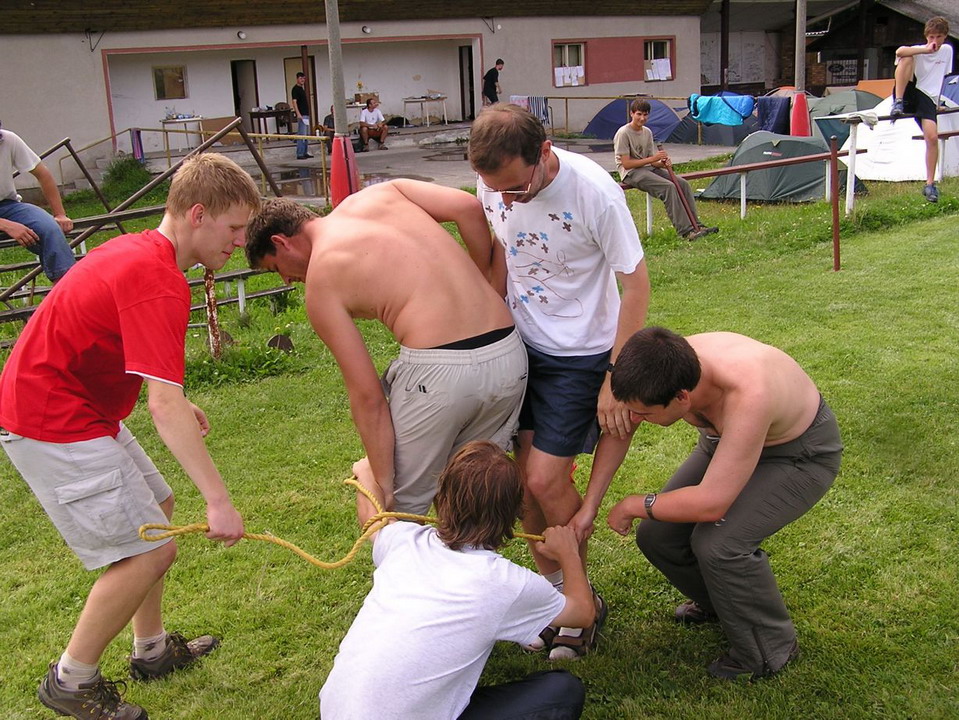 Vzhledem k tomu, že po cca 30 min běhání z nás všech stékal pot, byla další hra „Uzel“, méně náročná na fyzické schopnosti. Cílem této soutěže bylo provést co v nejkratším čase uzel na provaze, ovšem všichni členové skupiny se ho museli po celou dobu vázání držet jednou rukou.