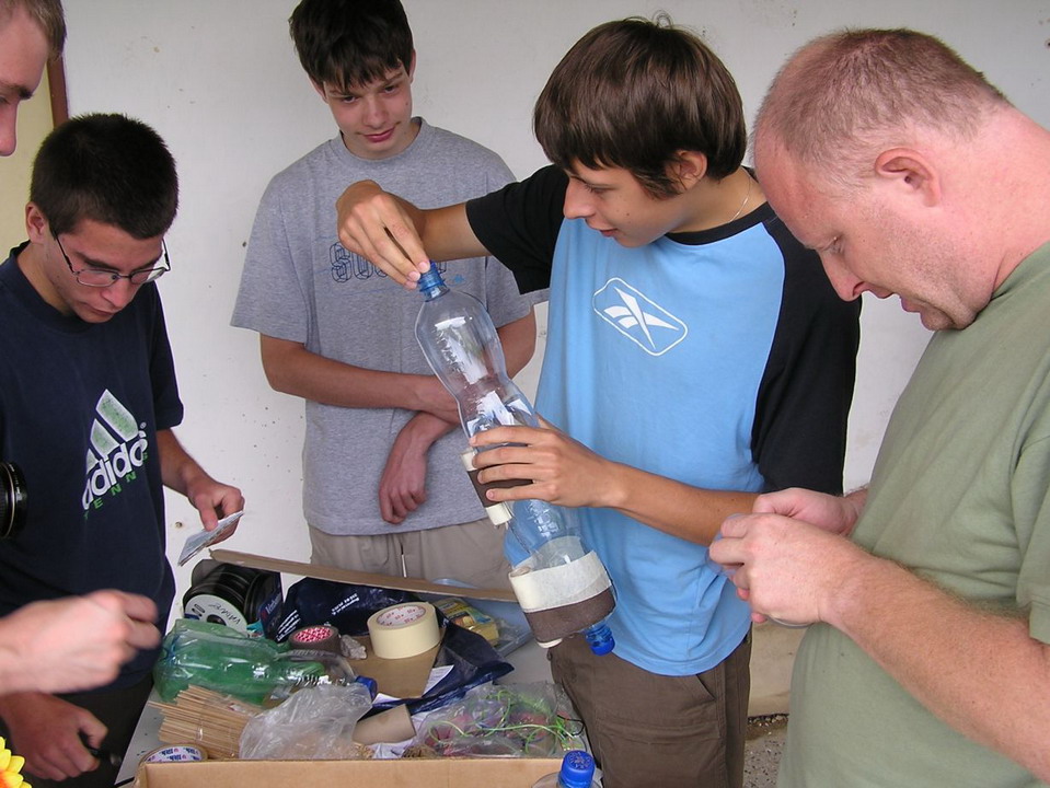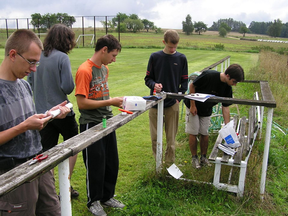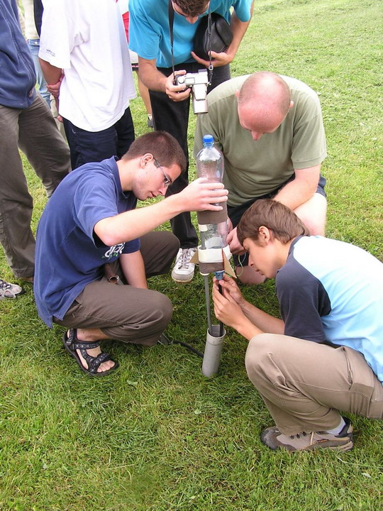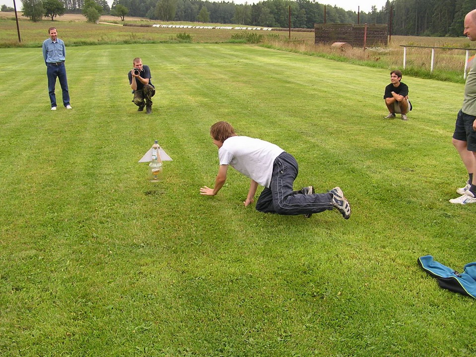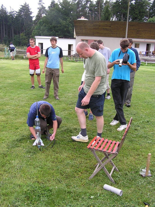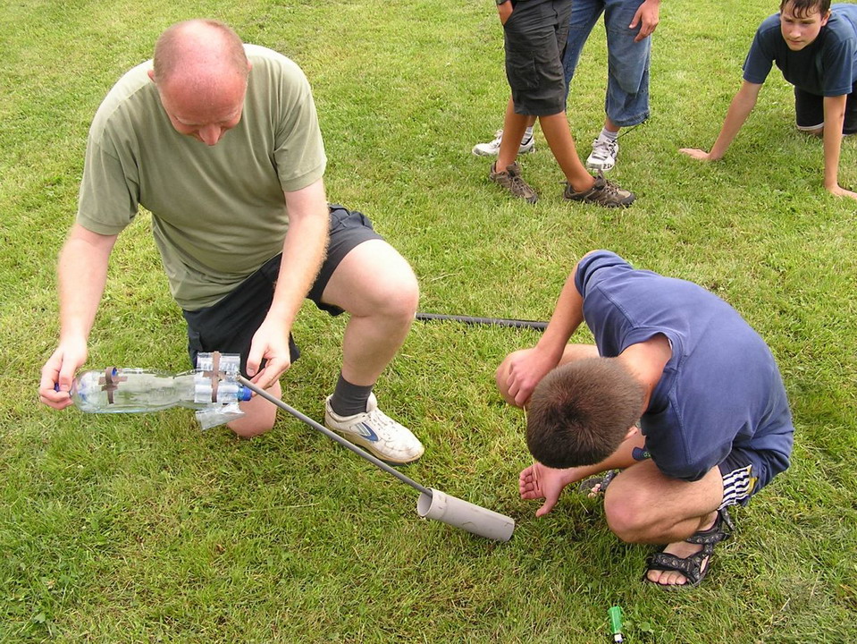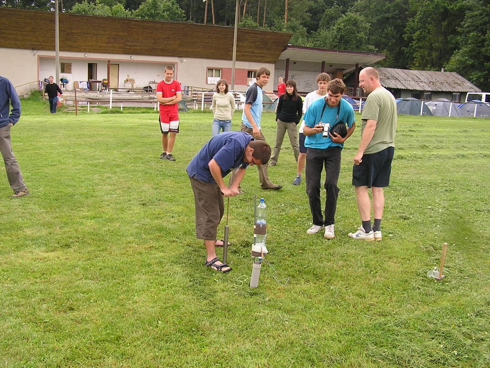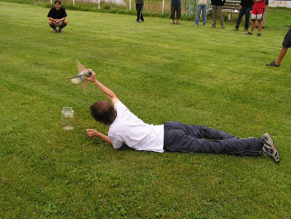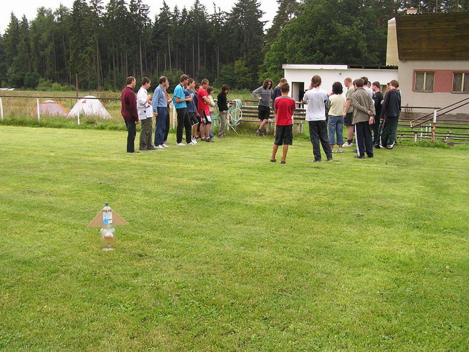 Na začátku bylo vytvořeno 5 skupin pro zvýšení soutěživosti mezi zúčastněnými a mohlo se začít. Prvním úkolem bylo sestavení rakety z předem připravených věcí, přičemž druh pohonu a typ rakety se v každé skupině odlišoval. Za několik desítek minut jsme se mohli na ploše fotbalového hřiště kochat prvními úspěšnými i neúspěšnými starty hned několika druhů létajících strojů. Pravděpodobně největší obdiv si získala raketa, jejímž pohonem byla chemická reakce mezi jedlou sodou a octem. Značných výšek dosahovaly i „vodní“ rakety. Neméně zajímavé byly také „acylpyrinové“ a „sirkové“ rakety.