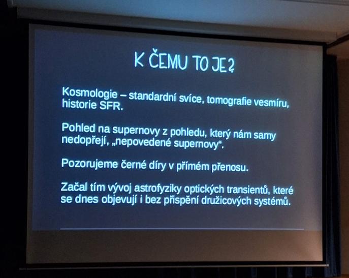 Závěrečná přednáška zavedla posluchače do světa robotických dalekohledů a jednoho z nejenergetičtějších jevů ve vesmíru – gama záblesků (Gamma-ray bursts, GRBs). Tyto velmi vysokоenergetické záblesky, které mohou emitovat záření gama, rentgenové, optické i radiové vlny, jsou pravděpodobně projevem zrodu černé díry při kolapsu velmi hmotných hvězd (supernovy typu Ib/c).