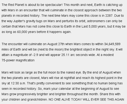 A co jste se mohli na přednášce dozvědět? Zejména informaci o tom, že Mars nikdy nebude veliký Měsíc. Nutno podotknout, při pohledu ze Země. Kde se tato mylná informace vzala? Původ pravděpodobně pochází z anglicky psaného článku, který vznikl v srpnu 2003 při příležitosti největšího přiblížení Marsu k Zemi. V článku se totiž mimo jiné píše, že při použití dalekohledu s 75-ti násobným zvětšení, bude kotouček Marsu stejně veliký jako je Měsíc v úplňku při pozorování pouhým okem. Náhoda tomu asi přispěla, ale při formátování textu se mezi slova o použití dalekohledu a velikosti Marsu dostal nový odstavec. A v tom okamžiku stačilo, aby v textu ještě chyběl údaj o roce, kdy k události dojde a zkáza byla dokonána. Mail kolující již třetím rokem je tomu důkazem.