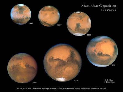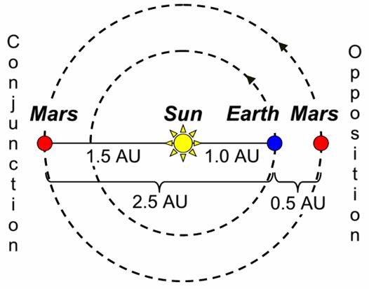 Ve skutečnosti je Měsíc ve srovnání s Marsem poloviční a i oběžné dráhy se liší, Měsíc obíhá okolo Země ve střední vzdálenosti 384 tisíc km. Mars má své stálé místo na vnější oběžné dráze kolem Slunce, průměrná vzdálenost přes 78 mil. km, přičemž nejvíce se k nám Mars přiblíží na vzdálenost 54,4 mil. km (při tzv. opozici), pokud je „schován“ za Sluncem, dělí ho od nás více než 400 mil. km. Opozicí rozumíme okamžik, kdy se Země dostane mezi Mars a Slunce. K tomuto úkazu dochází jednou za 26 měsíců, přičemž zejména výstřednost a sklon oběžné dráhy Marsu přispívají k tomu, že úhlový průměr Marsu se opozice od opozice mění. Maximálně může dosáhnout 25,2 úhlových vteřin.