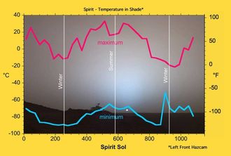 I teplota je velmi odlišná od toho, na co jsme zvyklí na Zemi. Dochází zde k velkým rozdílům teplot mezi dnem a nocí (-130°C až +20°C), nepředstavitelný rozdíl teplot na jednom místě ne Zemi. Mars za tyto podmínky vděčí větší vzdálenosti od Slunce a právě řídkou atmosférou.