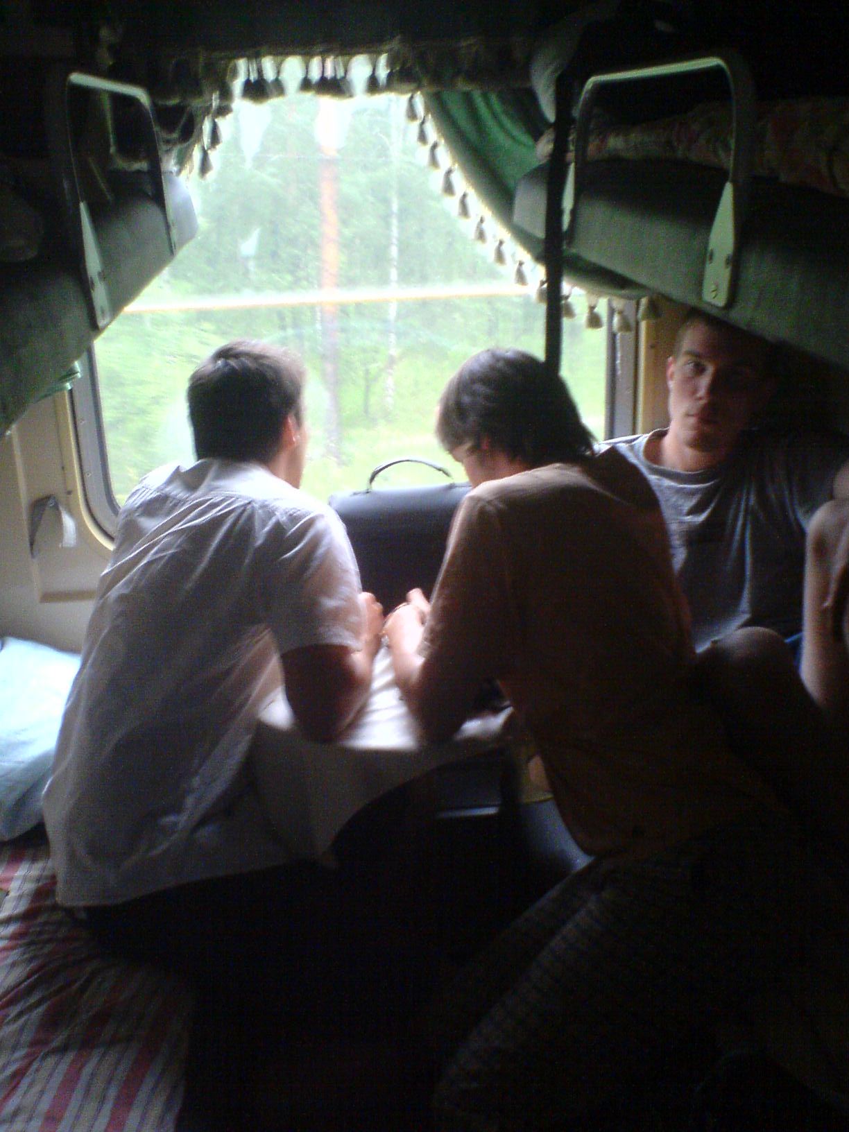 Ve vlaku nám „patří“ jedno dvoulůžkové (obýváno Martinem a mnou) a jedno čtyřlůžkové, kde trávíme většinu času konverzací, hraním her (neboli společenskou zábavou) a v případ Jiřího Mináře i skládáním básní.