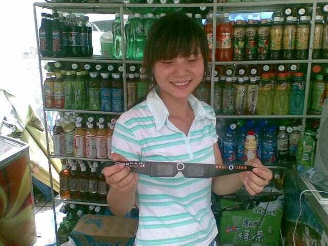 Zdravime z Pudongu,vcera jsme byli ve starem meste a dneska prochazime Pudong,prave jsme byli v morskem akvariu a jdem zkusit observatory.Na ulici tu prodavaji bryle k pozorovani zatmeni.