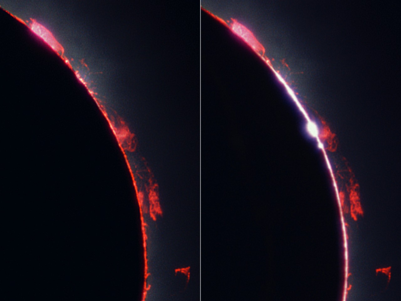 Tato mozaika dvou snímků zachycuje poslední sekundy úplné fáze zatmění. Detailně zobrazuje část slunečního okraje s chromosférou a protuberancemi (levý snímek) a první Bailyho perly (pravý snímek). Bailyho perly jsou první paprsky slunečního světla, které začne na konci zatmění prosvítat údolími na nerovném okraji Měsíce. Obdobný úkaz lze pozorovat také na začátku úplné fáze zatmění. Zpracování těchto fotografií provedl prof. RNDr. Miloslav Druckmüller, DrSc. a každý snímek je složen ze tří jednotlivých snímků.