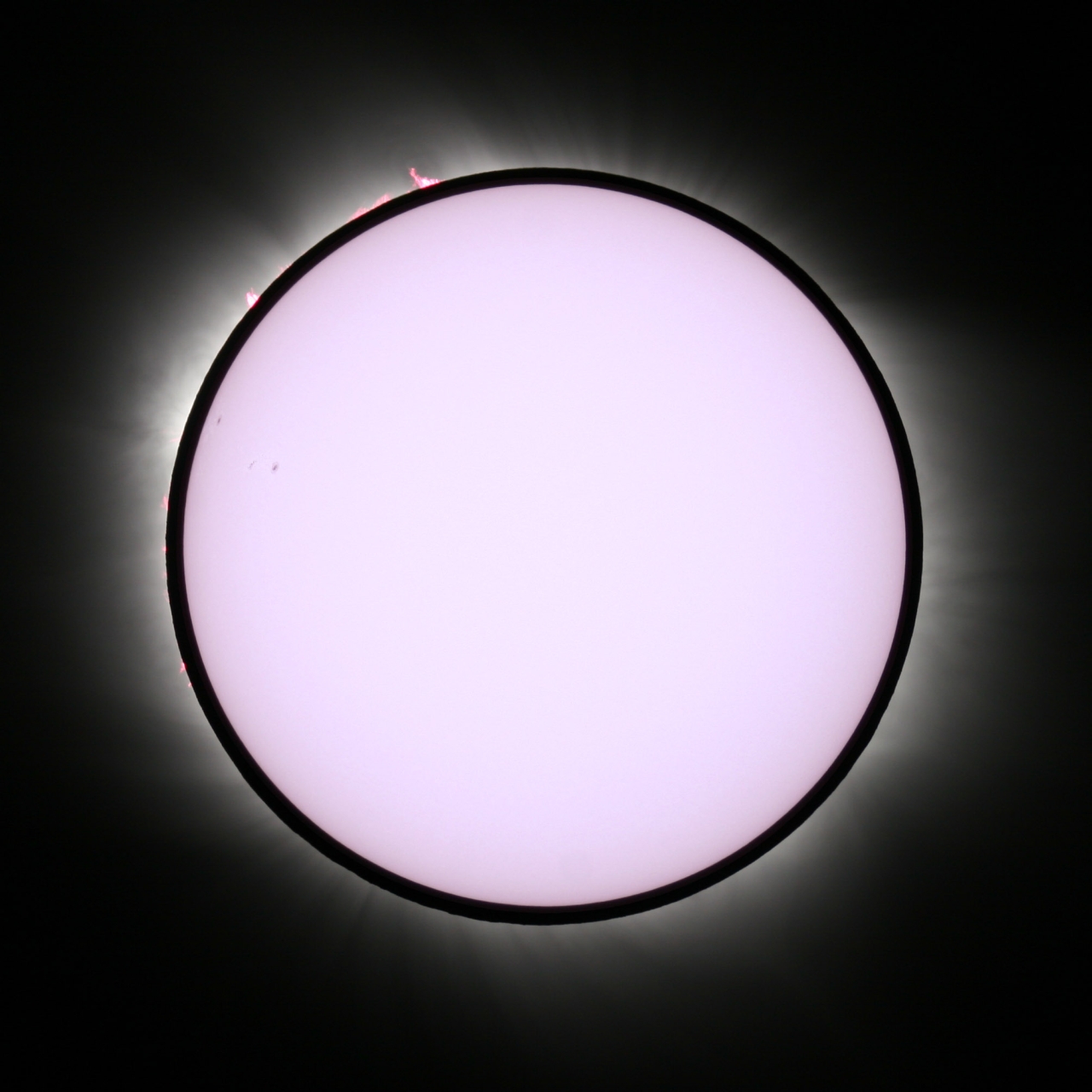 Kromě protuberancí a nízké koróny je na slunečním disku vidět také několik skupin slunečních skvrn. Pro úplnost zde uvádím parametry zatmění pro naše pozorovací místo. Doba trvání úplné fáze: 3 min 45 s, šířka stínu: 173 km, úhlová poloměr Slunce: 16' 1.1", úhlová poloměr Měsíce: 16' 35.1"
