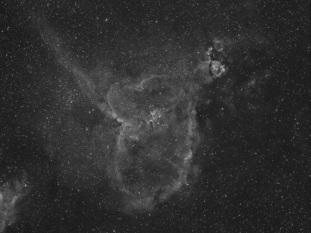 Velká emisní mlhovina ve východní části souhvězdí Kasiopeja severně od dvojité hvězdokupy Χ a h v souhvězdí Persea. Mlhovina o úhlovém průměru 2° obklopuje řídkou otevřenou hvězdokupu o úhlovém průměru 25'. Vpravo nahoře na ní navazují 2 menší mlhoviny o úhlovém průměru 20'. Jasnější mlhovinu NGC 896 (vpravo) a slabší IC 1795 rozděluje proužek temné hmoty. Vlevo těsně u mlhoviny je otevřená hvězdokupa NGC 1027 o úhlovém průměru 20'.