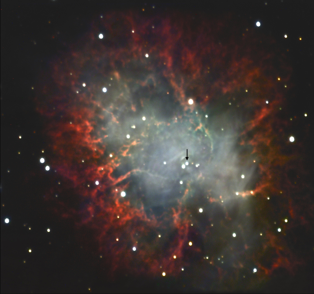Krabí mlhovina je pozůstatkem supernovy, která explodovala v roce 1054. Záznamy z čínských kronik vypovídají o tom, že se na obloze objevila nová natolik jasná hvězda, že byla pozorovatelná i za denního světla, a to po dobu 23 dní. Stala se tak po Slunci a Měsíci nejjasnějším objektem na obloze. Jako pozůstatek po výbuchu supernovy můžeme pozorovat ve středu mlhoviny pulzar (označený šipkou), který rotuje velmi vysokou rychlostí asi 30 otáček za sekundu. Hmotnost pulzaru převyšuje hmotnost našeho Slunce, ale jeho průměr je kolem 30 km. Samotná Krabí mlhovina má průměr 13 světelných let a stále se rozpíná rychlostí 1 500 kilometru za sekundu. Materiál mlhoviny má teplotu mezi 11 000 a 18 000 K.