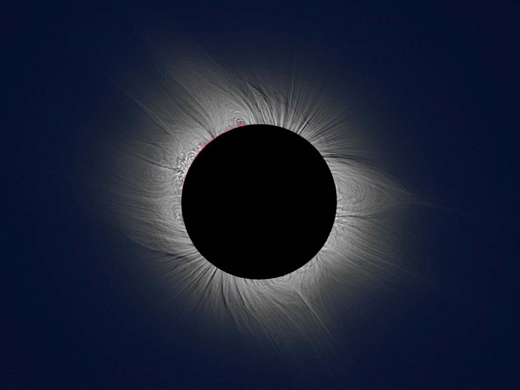 V posledních letech měli členové Západočeské pobočky možnost účastnit se několika expedic za úplným zatměním Slunce. Někteří z nich v průběhu deseti let zvládli napozorovat i čtyři úplná zatmění a to s takovým výsledkem, za který by se nemusela stydět žádná profesionální hvězdárna. Důkazem vám může být i tato krásná fotografie Vladany Šmídové, která určitě stojí za povšimnutí. Snímek vznikl složením cca 40 jednotlivých snímků s expozičními časy 1/1000s až 1/15s a zvýrazněním jemné struktury koróny. Zpracování bylo provedeno ve Photoshopu. Více informací o samotné expedici naleznete na našich webových stránkách.