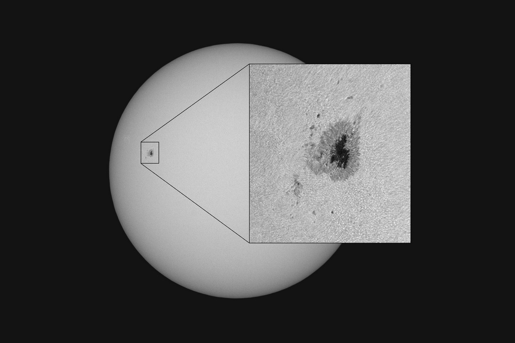 Jedním z nevýznamnějších projevů sluneční aktivity jsou sluneční skvrny, které můžeme pozorovat ve fotosféře Slunce. Teplota slunečních skvrn je o více než 1000 K nižší než je teplota okolní fotosféry 5800 K. Na první pohled se nám může zdát sluneční skvrna výrazně tmavší, je to však pouze zdánlivý klam, protože se umocňuje kontrast mezi jasnější fotosférou a chladnější skvrnou. Samotná skvrna by zářila oranžovým světlem. Výskyt skvrn je závislý na aktivních oblastech, to znamená na místech, která mají „narušená“ magnetická pole. Stáří skvrn je většinou závislé na jejich velikosti. Menší skvrny můžeme pozorovat třeba jen pár hodin, ale ty velké jsme schopni pozorovat i několik měsíců. Každá větší skvrna se skládá ze dvou částí. Tmavá vnitřní část nese označení umbra (stín) a vnější část skvrny, která je světlejší, nazýváme penumbra (polostín). Na přiložené fotografii můžeme v detailu ještě pozorovat granulaci, která vzniká působením konvektivních proudů. Tyto proudy vytvářejí jakési buňky nepravidelného tvaru o velikosti stovek až tisíce kilometrů.
