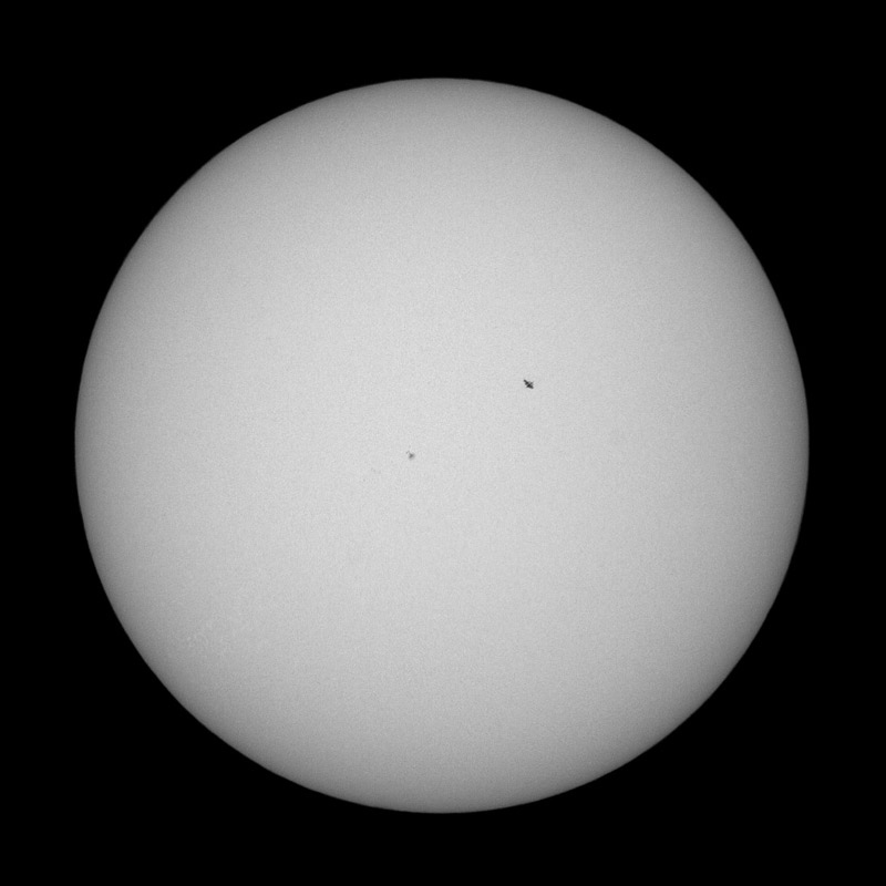 K nasnímání byl použit digitální fotoaparát Canon 350D, protože je zdánlivý pohyb stanice velmi rychlý (přes celý kotouč Slunce přeletí za cca 0,6s, což bylo tedy trvání celého úkazu) a tento fotoaparát umožňuje sekvenční snímání rychlostí 3 snímky za sekundu. Na snímku je zachycena ISS poblíž menší sluneční skvrny. Pro lepší představu o zdánlivé velikosti ISS a Slunce je ještě uveden celkový záběr v menším rozliąení. Vyfotografováno pomocí dalekohledu S-W ED80, expozice 1/4000s.