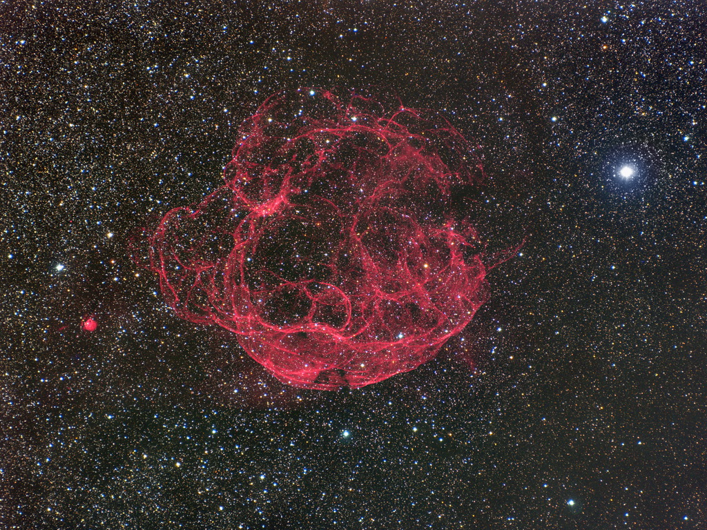 Fotografie Libora Šmída zachycuje krásnou mlhovinu známou pod označením Simeis 147, kterou někteří astronomové pojmenovali jako špagetová mlhovina. Mlhovina je pozůstatkem výbuchu supernovy na hranicích souhvězdí Býka. Objevena byla v roce 1952 na Krymské Astrophysical Observatory pomocí 25 palcový Schmidt-Cassegrain dalekohledu. Na obloze sice pokrývá oblast o velikosti cca 3 stupňů, ale vizuálně je vzhledem ke své jasnosti prakticky nepozorovatelná. Mlhovina jako pozůstatek po výbuchu supernovy vytváří krásný kulový plášť s vláknitou strukturou ve vzdálenosti odhadované na 3000 (± 350) ly. Předpokládá se, že v jejím středu se nachází rychle rotující neutronová hvězda, známá jako pulsar PSR J0538 2817.