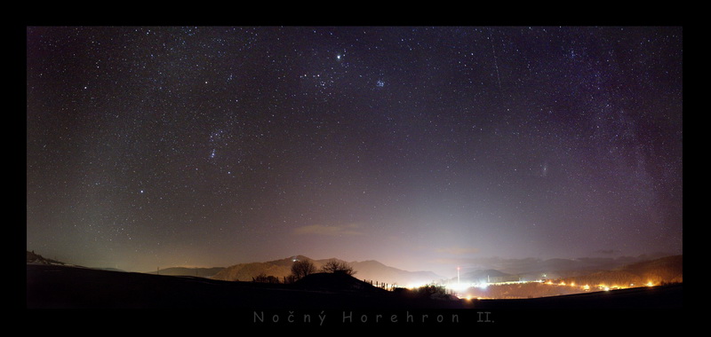 | Popis autora: | Fotografia panoramaticky zachytáva pohľad na oblohu (z ľava) od juhovýchodu až po severozápad a obec Valaskú spolu so Železiarňami Podbrezová. Kúsok od stredu naľavo je na horizonte vysvietená chata na Chvatimechu (bývalý Bernardín) - miesto odkiaľ vznikol prvý záber (na vrchole nad chatou).