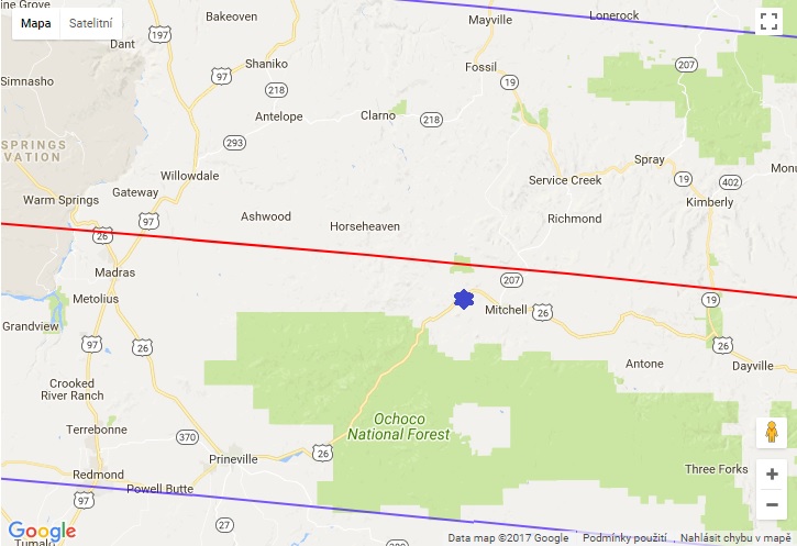 Z těchto důvodů byla na poslední chvíli pro pozorování vybrána poměrně pustá oblast na silnici 26 mezi městy Prineville a Mitchell.