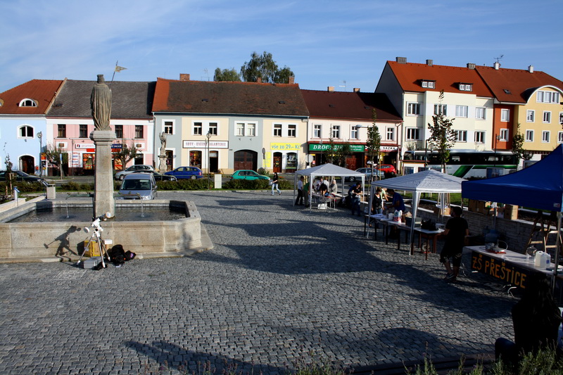 Nezajímavější část celého programu čekala na návštěvníky Evropské noci vědců přímo na náměstí. Pro veřejnost bylo připraveno několik dalekohledů, kde mohli návštěvníci pozorovat nejenom mlhoviny, hvězdokupy ale i další deep sky objekty, což by nebylo možné bez zhasnutého pouličního osvětlení a kostela, které pro nás zajistilo město. Součástí naší expozice na náměstí byla i výstava Astronomie v západních Čechách a model sluneční soustavy. Kromě toho se zde Západočeská pobočka České astronomické společnosti prezentovala expozicí, kterou jsme nazvali astronomická kuchařka. K vidění zde byla sladká a jedlá kometa, výbuch sopky na Marsu a řada dalších astronomických pokusů. V těsné blízkosti našeho stánku byly další stánky našich partnerů Základní školy Přeštice a Gymnázium Jaroslava Vrchlického Klatovy, kde se návštěvníci mohli seznámit s celou řadou zajímavých pokusů nejenom z biologie a fyziky.