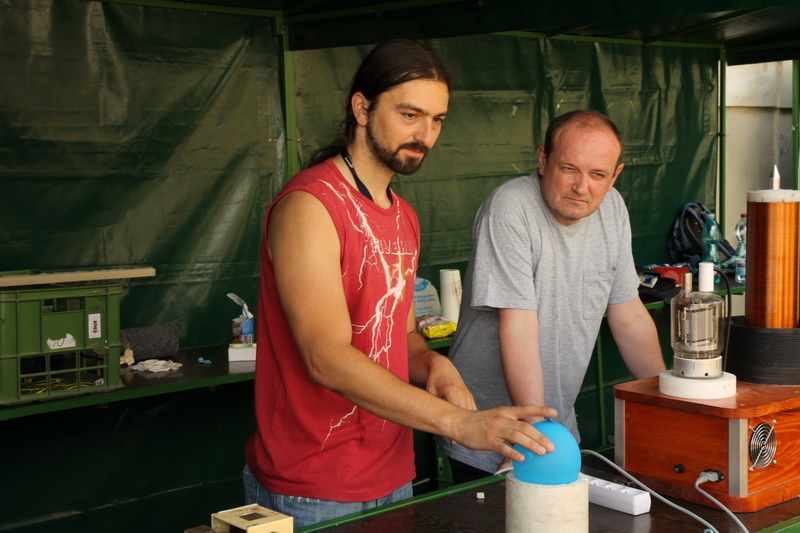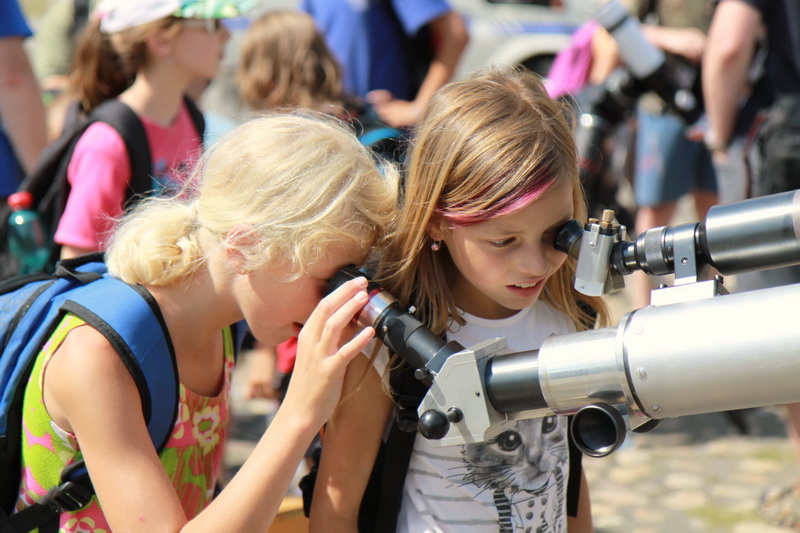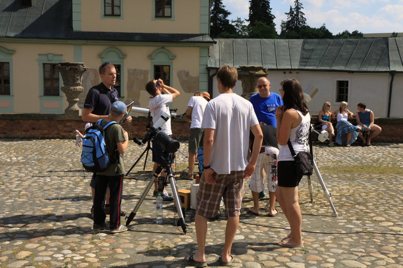 Celá akce začala ve 14h na Manětínském náměstí nedaleko kostela sv. Jana Křtitele, kde byla pro návštěvníky připravena celá řada aktivit od pozorování Slunce, přes fyzikální pokusy až po tematické hry pro ty nejmenší. Pozorování Slunce se neobešlo bez tradičního pozorování fotosféry ale i krásných protuberancí, které mohli návštěvníci obdivovat v chromosférickém dalekohledu Hvězdárny a planetária Plzeň. Mezi velmi zajímavé a taky velmi poučné patřily pokusy našich kolegů z Pedagogické fakulty oddělení fyziky, kteří si připravili řadu pokusu s elektřinou a elektrostatikou. Největším lákadlem se stal Teslův transformátor, který generoval napětí 240000 voltů. Zároveň bych neměl opomenout řadu zajímavých stolních her s astronomickou tématikou, které přilákaly nejenom děti, ale i jejich tatínky či dědečky. Kromě aktivit na náměstí byl v místním zámeckém parku nainstalován model sluneční soustavy, kde v pravidelných intervalech probíhaly komentované prohlídky od členů Západočeské pobočky.