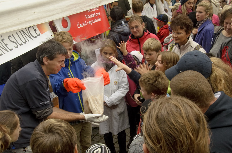 Hlavní část našeho programu se odehrávala od 16h na Domažlickém náměstí Míru. Kde bylo postaveno hned několik velkých i menších stanů, ve kterých desítky demonstrátorů předváděly pokusy z fyziky, chemie, biologie a dalších oborů. Západočeská pobočka ČAS se prezentovala oblíbenou show „Astronomická kuchařka“, při které můžete například ochutnat jedlou kometu (odkaz na video). Tento oblíbený pokus pak sklízí velké ohlasy, zejména mezi těmi nejmenšími. K dispozici byly připravené i dalekohledy pro pozorování vesmírných objektů jak členu Západočeské pobočky, tak i odborných pracovníku Hvězdárny a planetária Plzeň. K tomuto účelu bylo domluvené i zhasnutí veřejného osvětlení na náměstí pro zlepšení pozorovacích podmínek. Bohužel k samotnému pozorování astronomických objektů nedošlo, protože obloha byla po celou dobu zatažena nízkou oblačností. Proto jsme mohli s dalekohledy pozorovat jen zajímavé objekty v okolí náměstí.