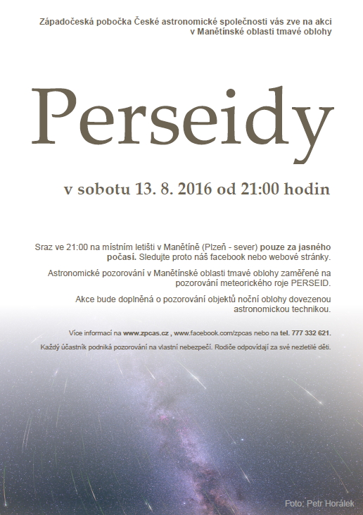 Akci pořádá Západočeská pobočka České astronomické společnosti. Bližší informace o samotném pozorování hledejte na našich webových a facebookových stránkách (www.zpcas.cz https://www.facebook.com/zpcas). Pozorování se uskuteční pouze za jasného počasí! Každý účastník podniká exkurzi na vlastní nebezpečí. Rodiče odpovídají za své nezletilé děti.