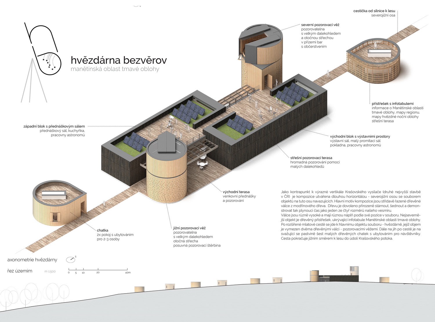 Při brouzdání na internetu jsem nedávno narazil na velmi zdařilou diplomovou práci Ondřeje Noska, jejímž obsahem je návrh nové hvězdárny v Manětínské oblasti tmavé oblohy. Jako místo nové hvězdárny zvolil kótu Krašov, kde je také umístěna nejvyšší stavba Plzeňského kraje. Jeho koncept hvězdárny je v našich luzích a hájích netradiční a neotřelý, svým ztvárněním krásně zapadá do místní krajiny a velmi vysoko hodnotím i jeho funkčnost. Z vybraných fotografií si můžete vytvořit vlastní obrázek. Níže přikládám pár řádek autora a gratuluji k takové práci.